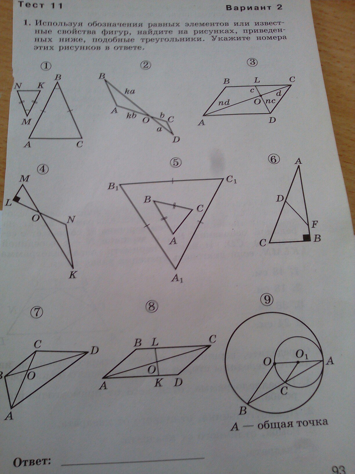 Помогите срочно!Используя обозначения равных элементов или известные свойства фигур,найдите на рисунках,приведенных ниже,подобные треугольники.Укажите номера этих рисунков.
