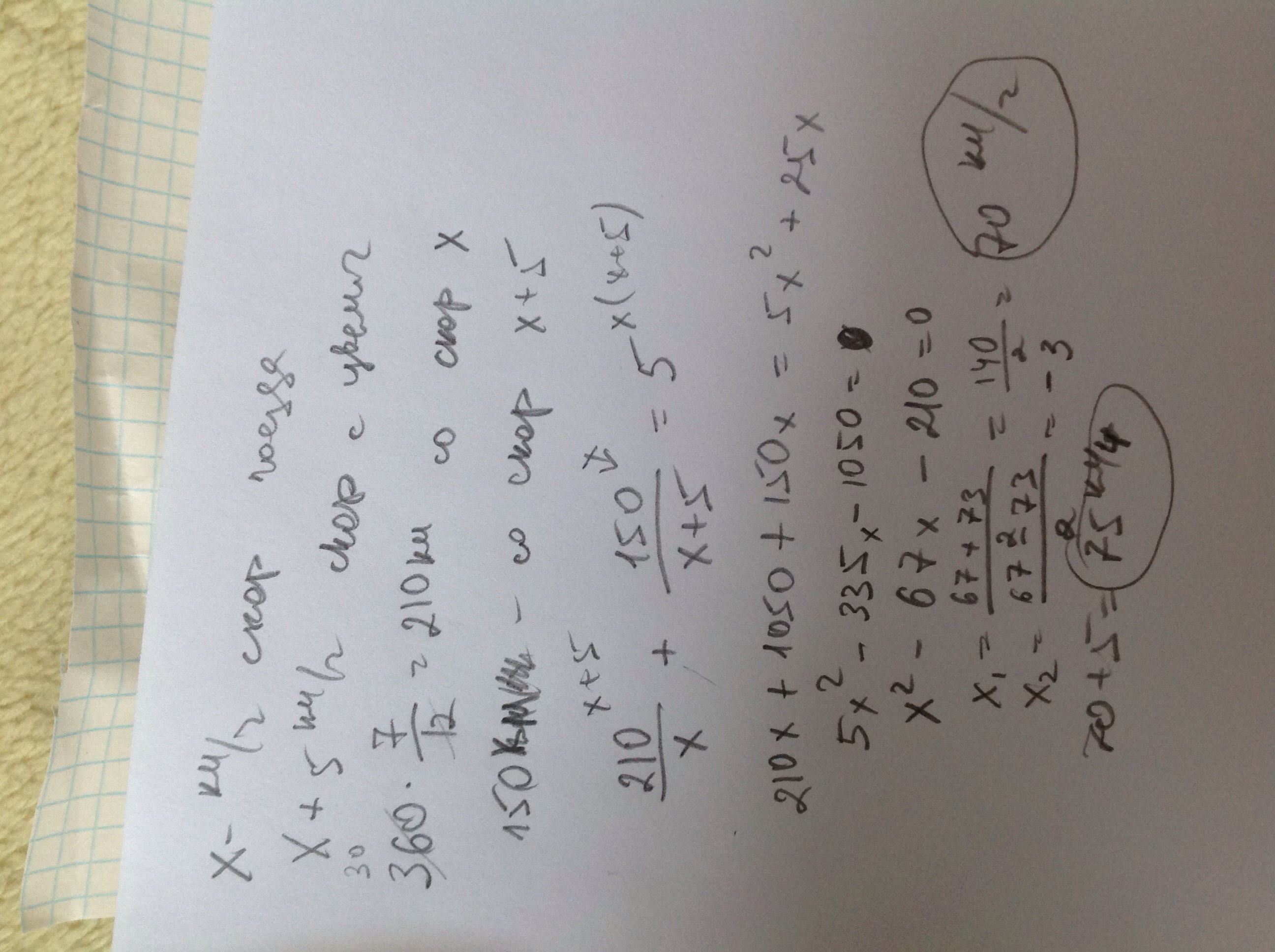 Решите задачу: Поезд должен был проехать 360 км. Проехав 7/12 этого расстояния, поезд увеличил скорость на 5 км.ч. Найдите скорость поезда на каждом участке движения, если на весь путь было затрачено 5 часов