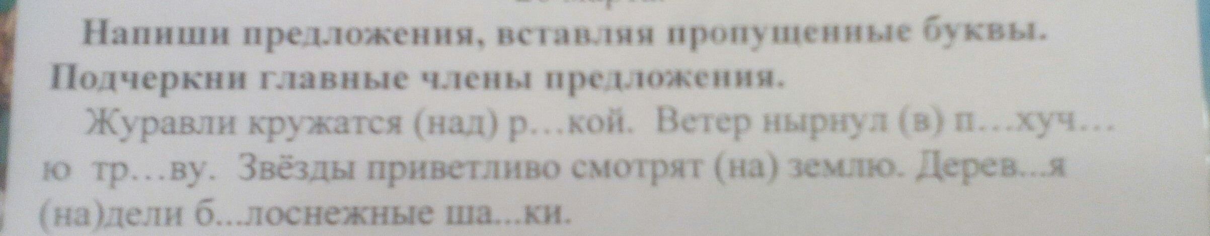 В первом предложении главные члены журавли кружатся,во втором ветер нырнул,в третьем звёзды смотрят,а в четвёртом деревья надели.
