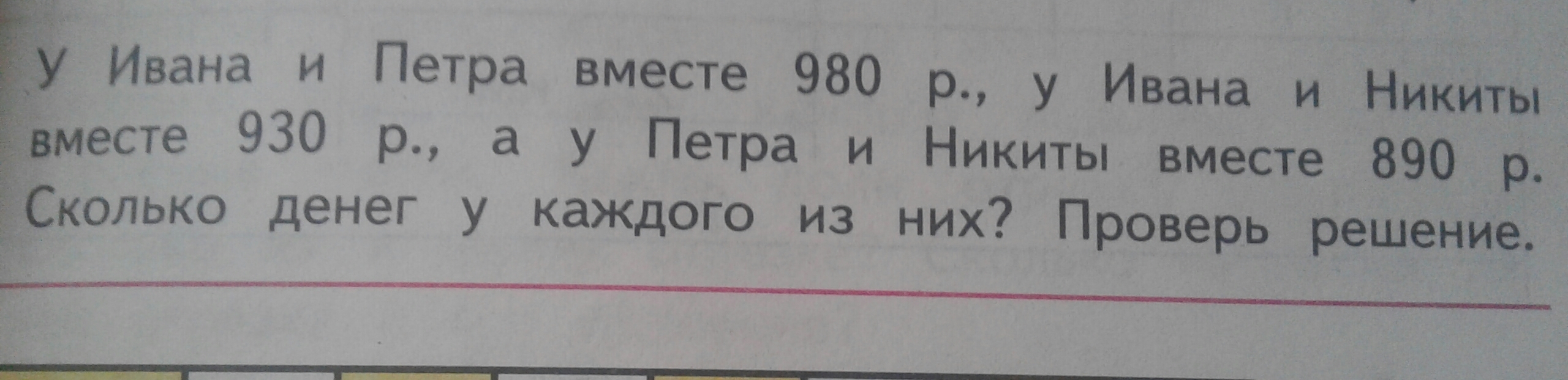 Ответ : 420 рублей у Никиты, 470 рублей у Петра, 510 - у Ивана.
