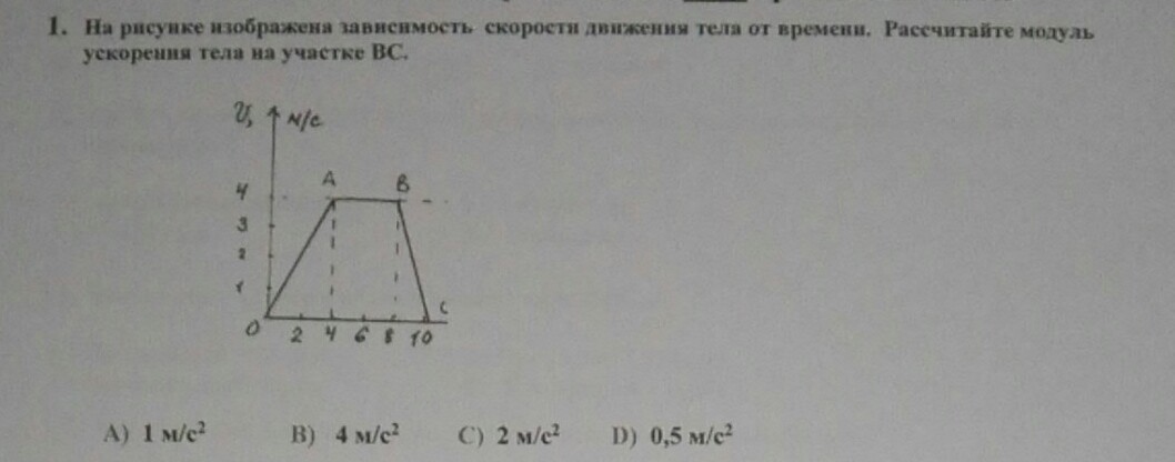 на рисунке изображена зависимость скорости движения тела от времени. рассчитайте модуль ускорения на участке BC