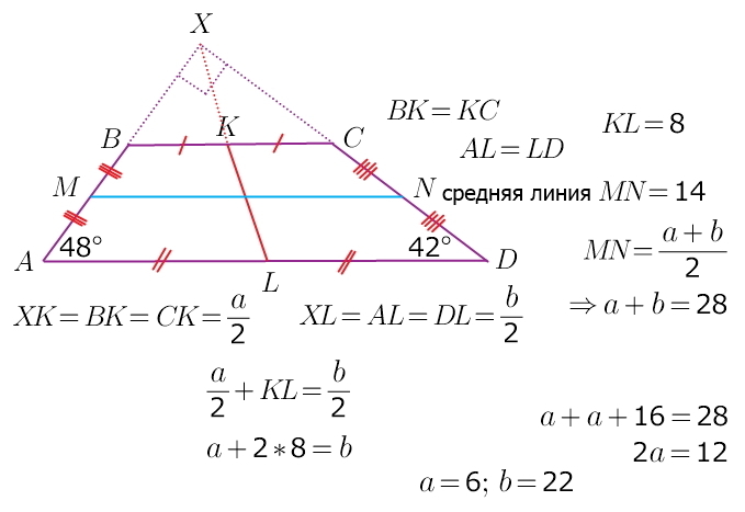 Углы при одном из оснований трапеции, равны 42° и 48°, а отрезки, соединяющие середины противоположных сторон равны 14 и 8. Найдите основания трапеции.