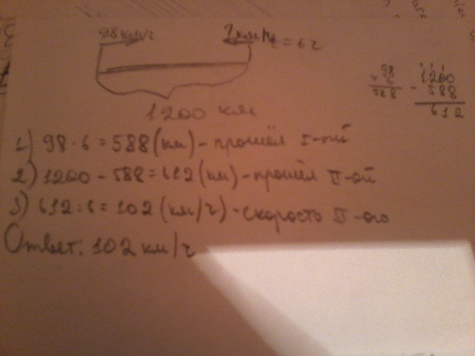 От двух берегов навстречу друг к другу выехали два теплохода . Расстояние между ними 1200 км. Скорость одного теплохода 98 км/ч . Чтобы они встретились им нудно пробыть в пути 6 часов . Найдите скорость теплохода .