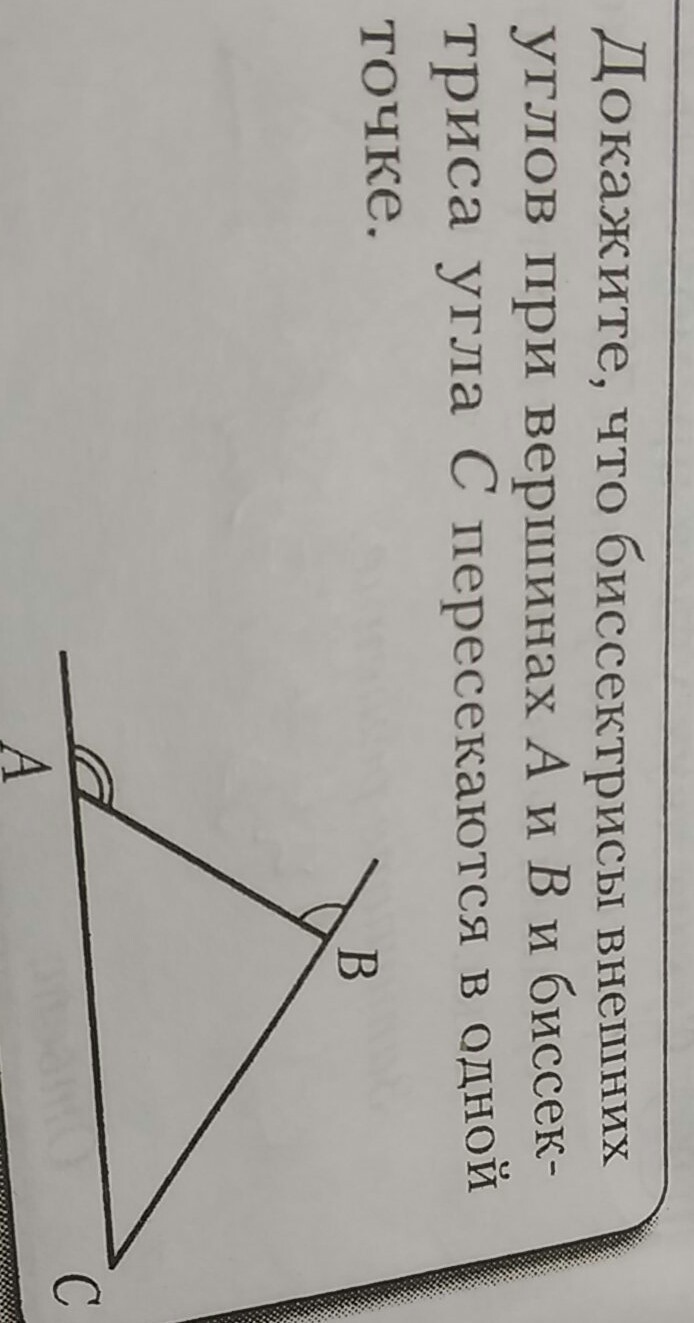 докажите,что биссектрисы внешних углов при вершинах А и В и биссектриса угла С пересекаются в одной точке