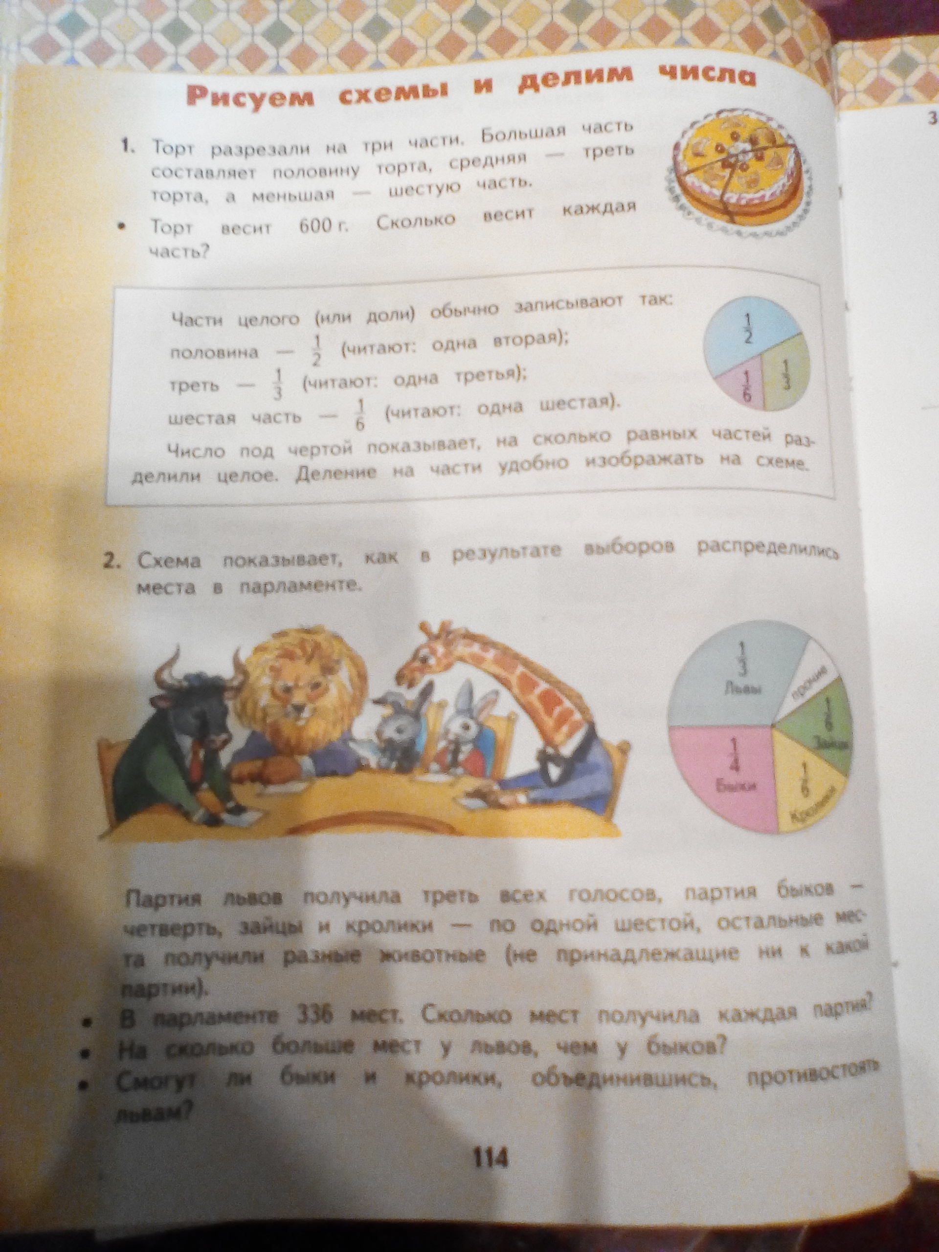 №1 2кг 550г=2550г 2550/6=425г №2 а) 120/3=40 284/6=47целых 1/3 (нарисуй 5 чёрточек) 324/9=36 (нарисуй 8 чёрточек) б) 196/4=49 232/8=29 180/5=36 в) 24/6=4 (в сутках 24 часа) 366/3=122 (в високосном году 366 дней) 60/6=10 №3 325/5=65м №4 24/3=8 ч сна 24-8=16 бодрствование №5 24*4=96ч 96/3=32ч