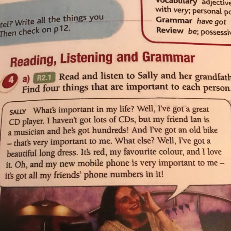Що важливо в моєму житті? Ну, у мене є відмінний програвач компакт-дисків. У вас немає багато компакт-дисків, але мій друг лан музикант і у нього є сотні! І у мене є старий велосипед, який дуже важливий для мене. Що ще? Ну, l'Ве отримав гарне довге плаття. Це червоний, мій улюблений колір, і я люблю його. О, і мій новий мобільний телефон дуже важливий для мене його отримали всі моїх друзів телефони в ньому!
