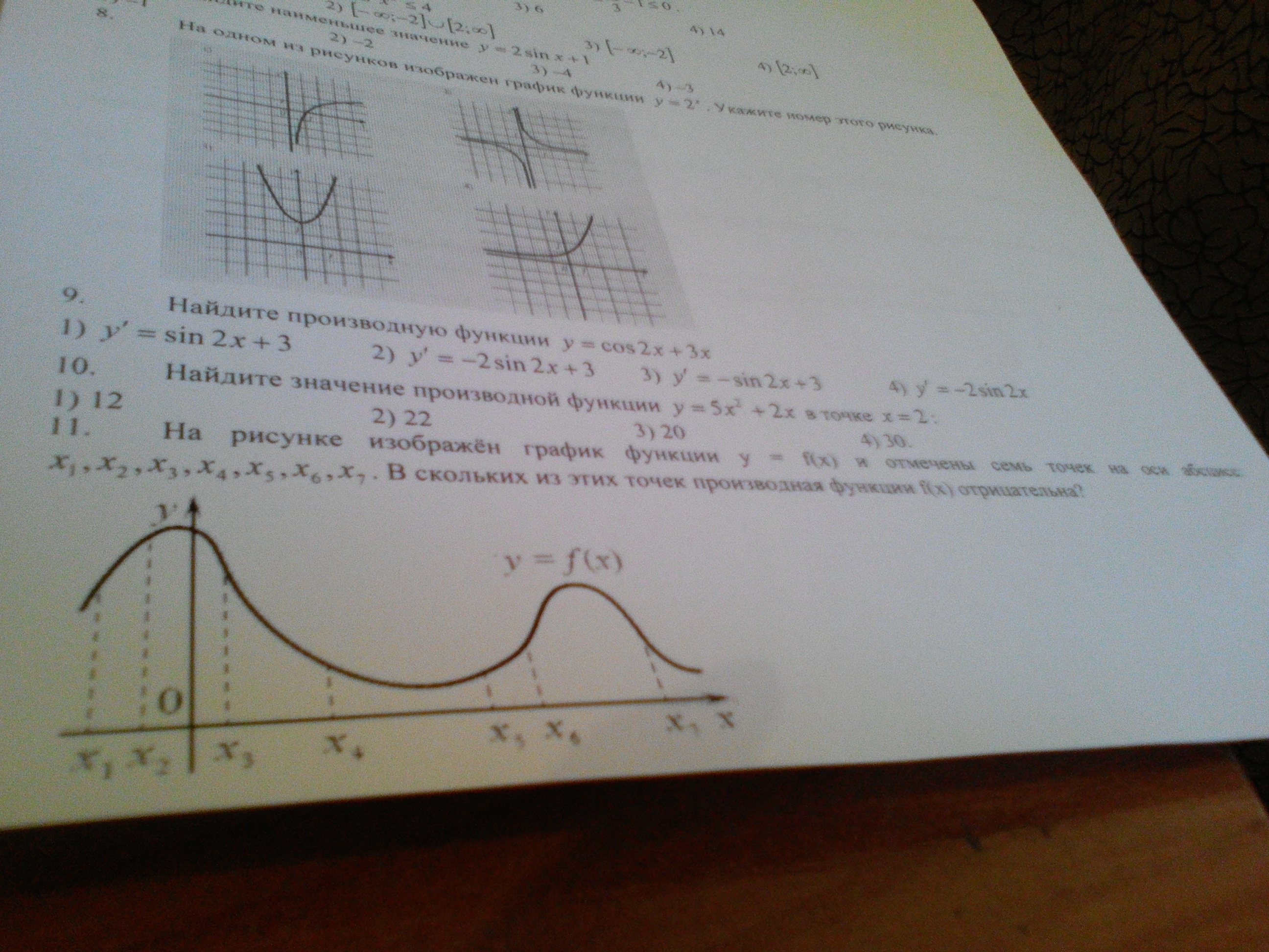 Производная отрицательна в двух точках: х₄ и х₇ , так как , если провести касательные к графику в этих точках, то они будут образовывать тупой угол с положительным направлением оси ОХ .