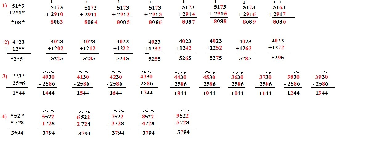 найди несколько решений каждого равенства или лучше просто неизвестные, все в столбик срочно плиз!!! 51?3+2?1?=?08?, 4?23+12??, ??3?-25?6=1?44, ?52?-?7?8=3?94
