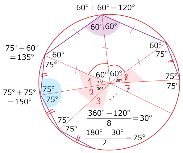 наименьший угол 10-угольника = 120°, наибольший = 150°