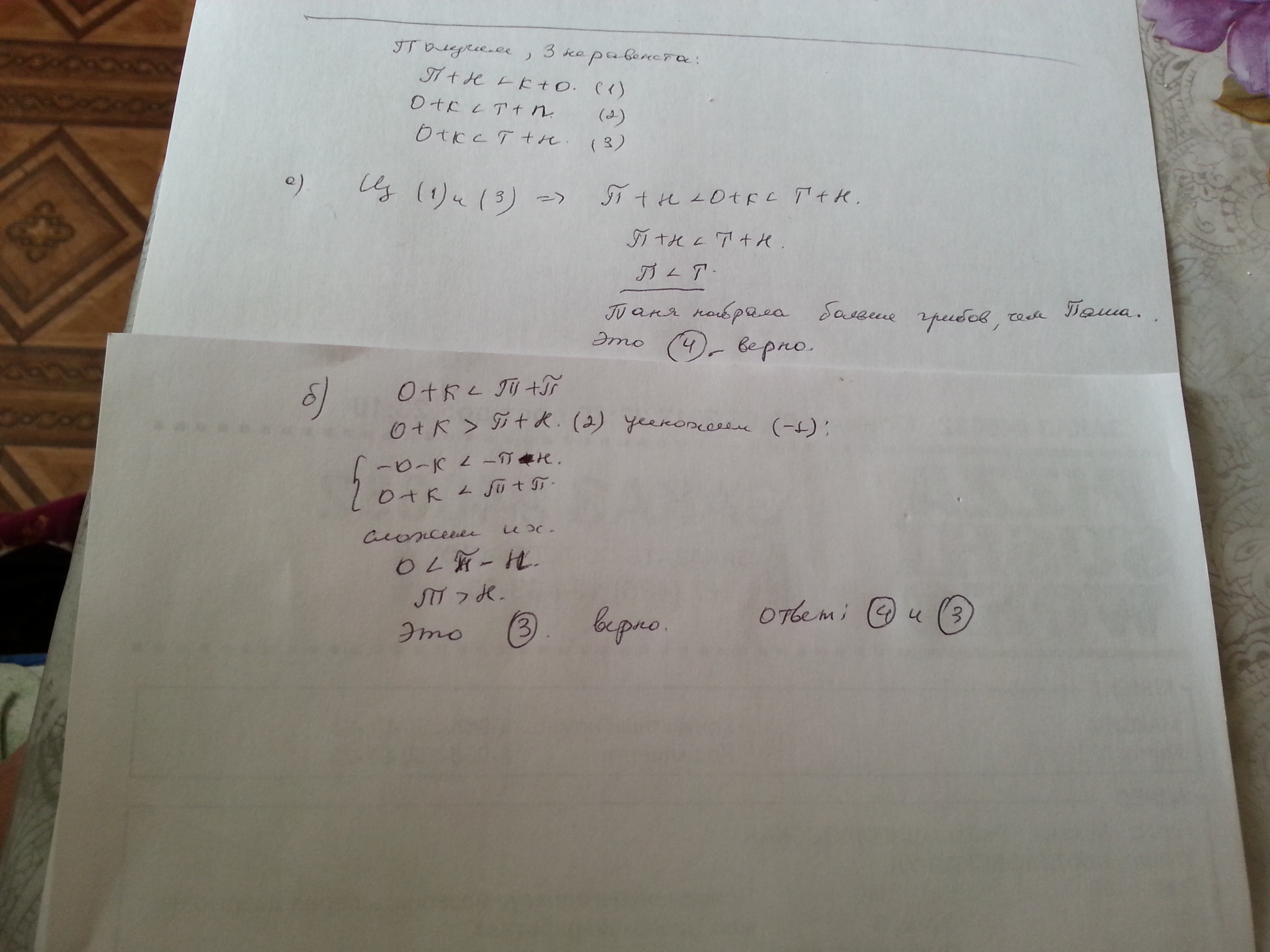 18 Ребята собирали в лесу грибы. Паша и Наташа собрали меньше грибов, чем Коля и Оля, а Таня и Паша — больше, чем Оля и Коля. Кроме того, Коля с Олей собрали меньше грибов, чем Таня и Наташа, Выберите утверждения, которые следуют из приведённых данных. 1. Наташа собрала больше грибов, чем Паша. 2. Коля собрал меньше грибов, чем Оля. 3. Таня собрала больше грибов, чем Наташа. 4. Паша собрал грибов меньше, чем Таня. В ответе укажите номера выбранных утверждений без пробелов, запятых и других дополнительных символов.