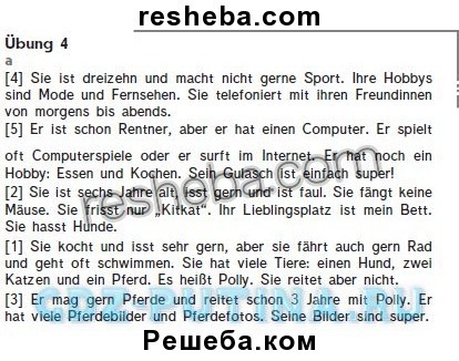 [4] Ей 13 лет, и она не любит заниматься спортом. Её хобби - это мода и телевидение. Она разговаривает по телефону со своей подругой с утра до вечера.