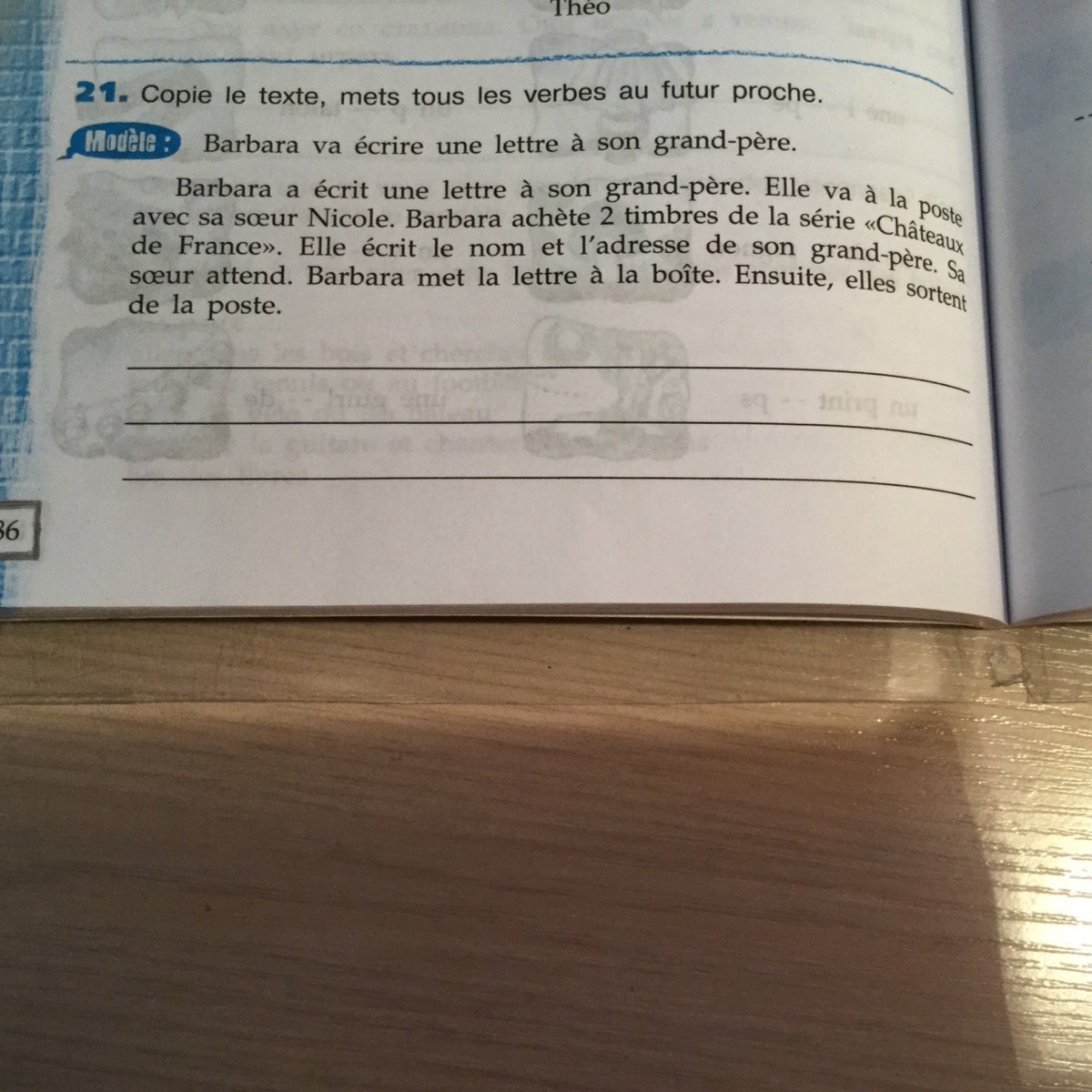 Barbara va écrire une lettre à son grand-père. Elle va aller à la poste avec sa soeur Nicole. Barbara va acheter 2 timbres de la série "Châteaux de France". Elle va écrire le nom et l'adresse de son grand-père. Sa soeur va attendre. Barbara va mettre la lettre à la boîte. Ensuite, elles vont sortir de la post.