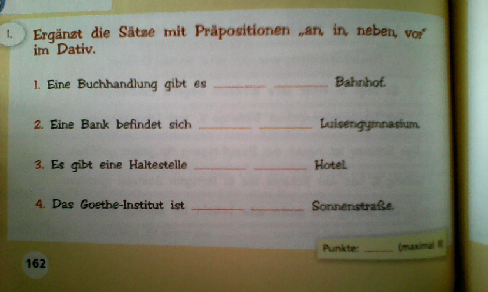 3. Die Apotheke bafindet sich den Supermarkt gegenüber.