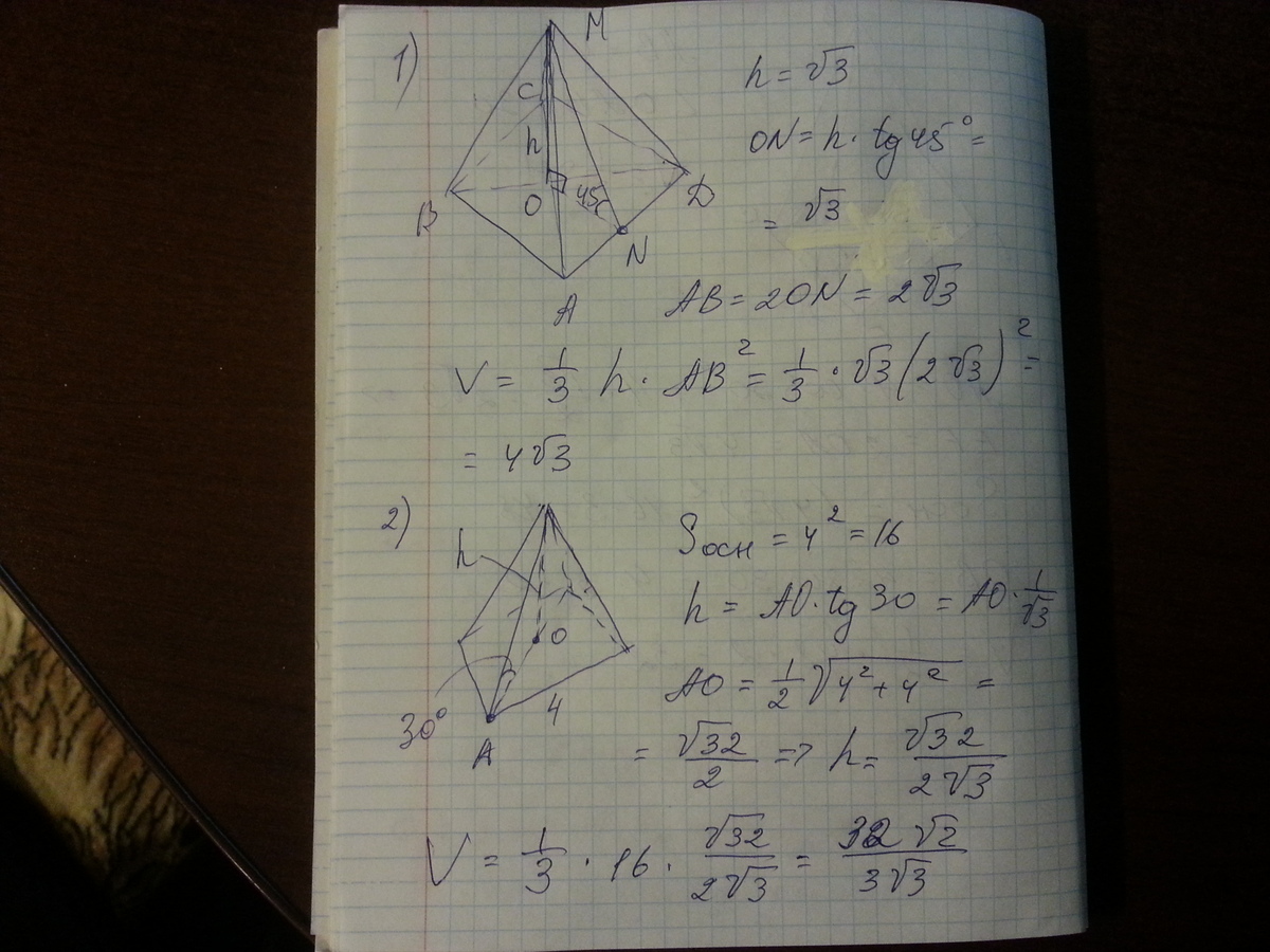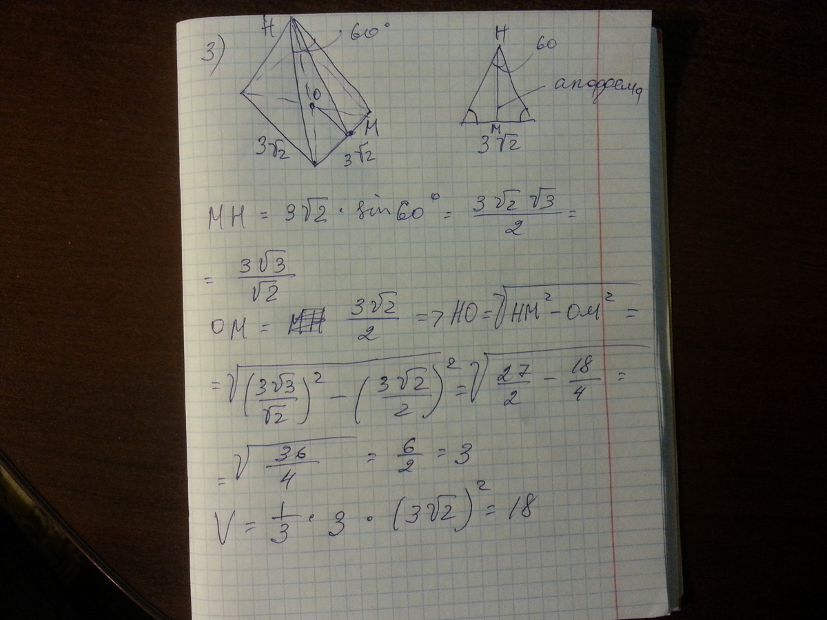 Помогите пожалуйста решить несколько простых задач: 1) В правильной треугольной пирамиде двугранный угол при основании равен 45, а высота пирамиды равна √3 Найдите объём пирамиды 2)В правильной треугольной пирамиде угол между боковым ребром и плоскостью основания равен 30, а боковое ребро равно 4 Найдите объём пирамиды 3) В правильной треугольной пирамиде сторона основания равна 3√2, а плоский угол при вершине равен 60. Найдите объём пирамиды