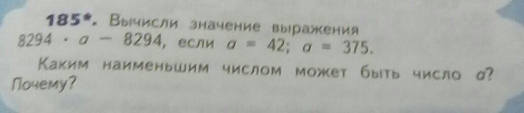 думаю, минимальное число, которым может быть а = 1. Так так, в том случае 8294*1-8294=0. А если а будет меньше 1, тогда в отвее будет отрицательное число