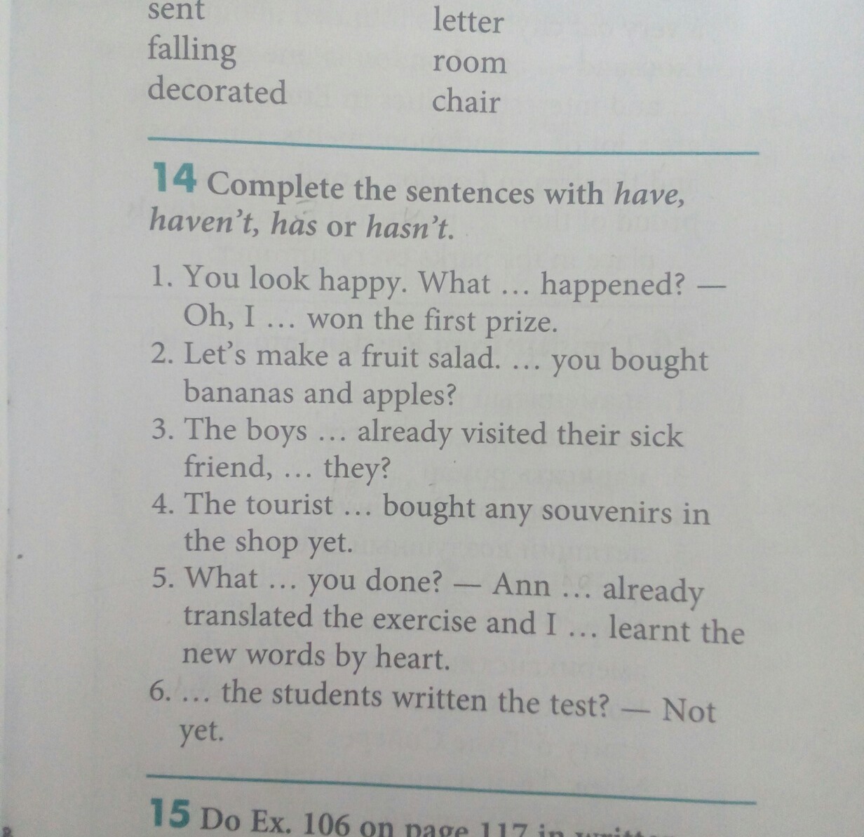 1.Has, have.2.have 3 have 4 hasn`t 5 Have, have 6 Have.