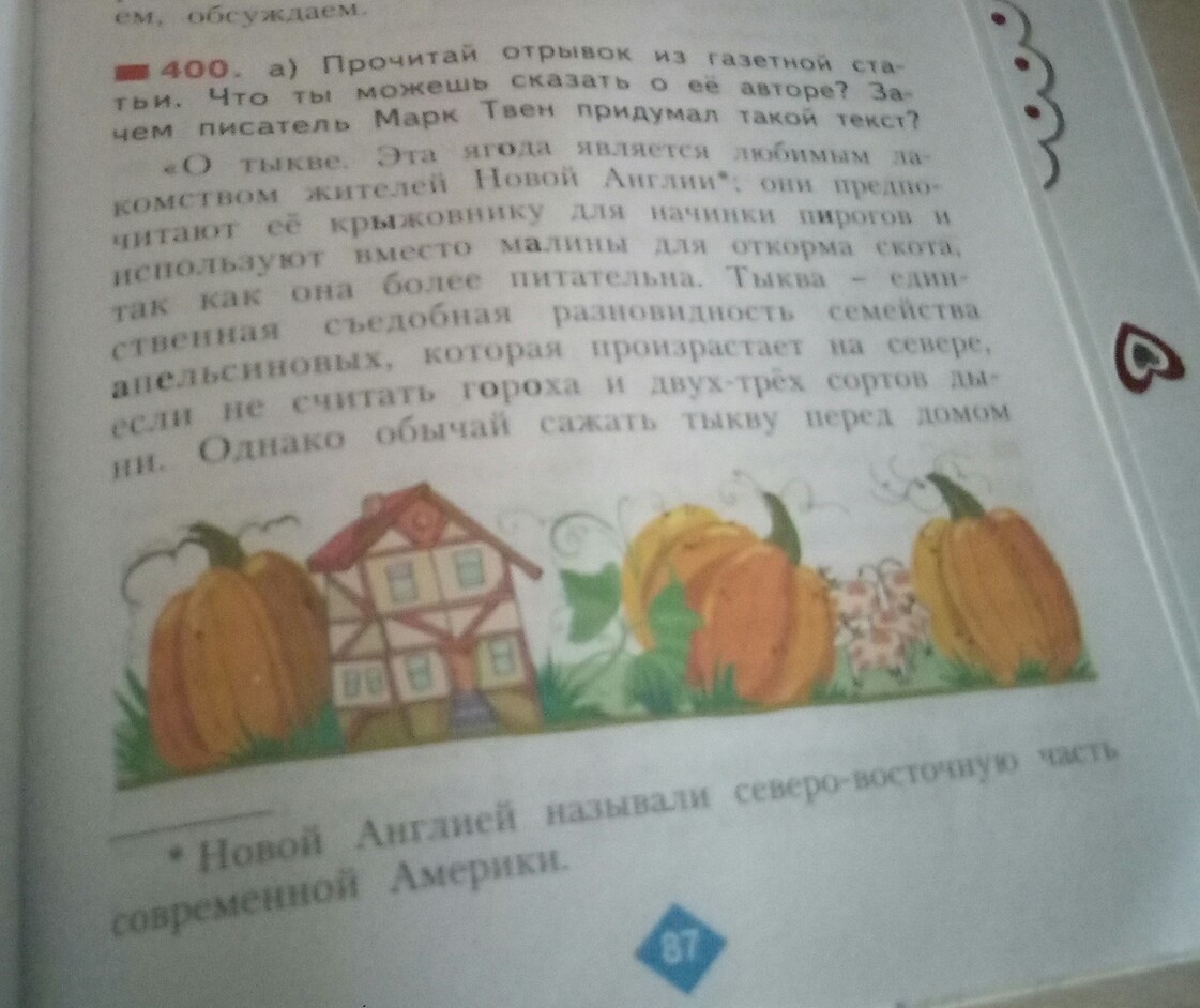 Её автор рассказывает что все жители Новой Англии любят тыкву. И предпочитают для пирога крыжовник, вместо малины. И что тыква - единственная съедобная разновидность семейства апельсиновых. Которая растёт на севере. А вот зачем писатель придумал такой текст я не знаю.