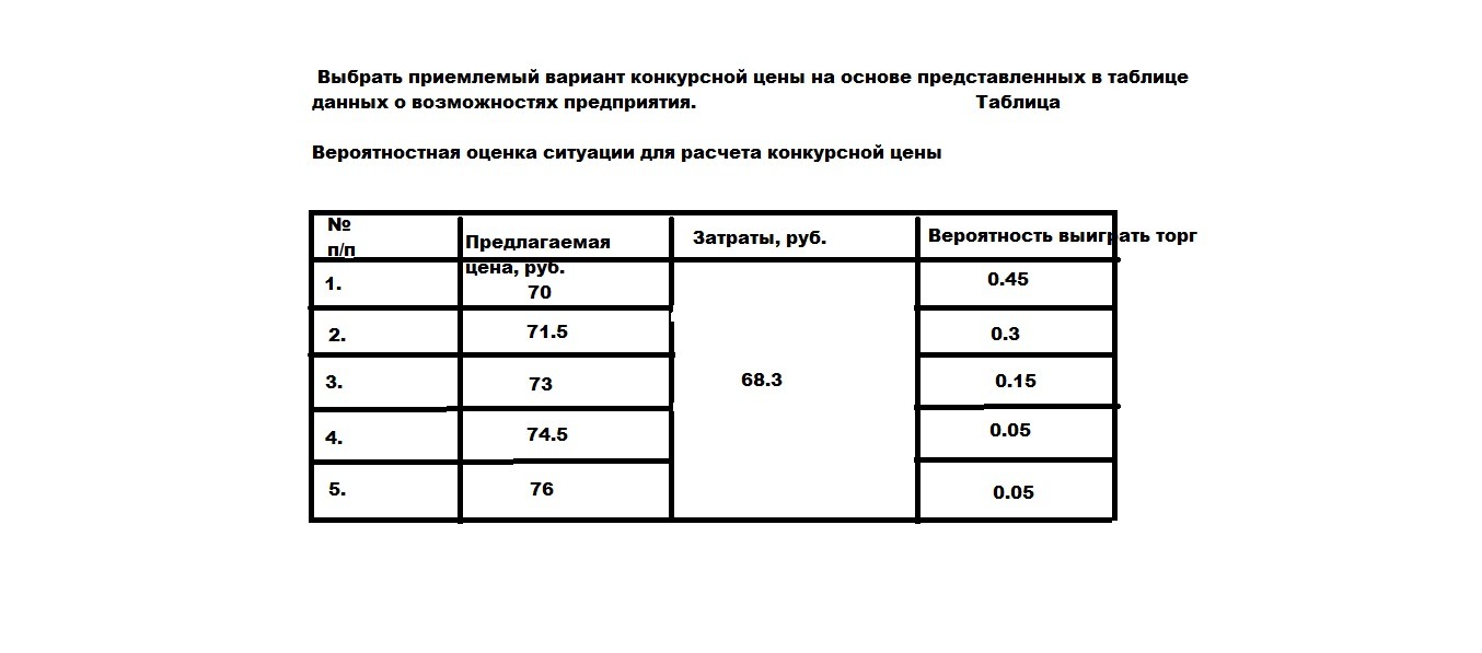 Вывод: вариант цены 71,5 ден. ед. наиболее приемлем для участия в торгах, так как по расчетам ожидаемая прибыль при этой цене максимальна.
