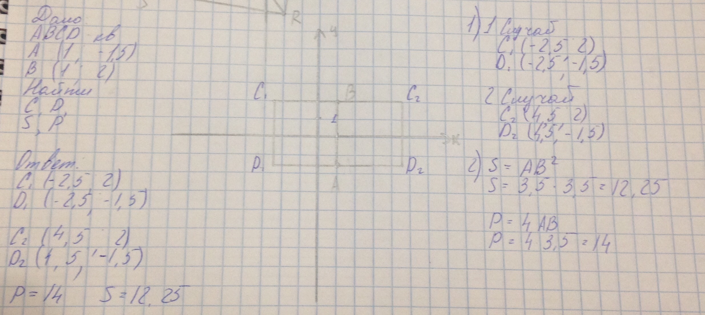 Даны координаты двух вершин квадрата ABCD : A ( 1, -1,5) и B (1,2). Начертите квадрат ABCD ( рассмотрите два случая ). Найдите координаты вершин С и D Вычислите площадь и периметр ABCD . Пожалуйста помогите