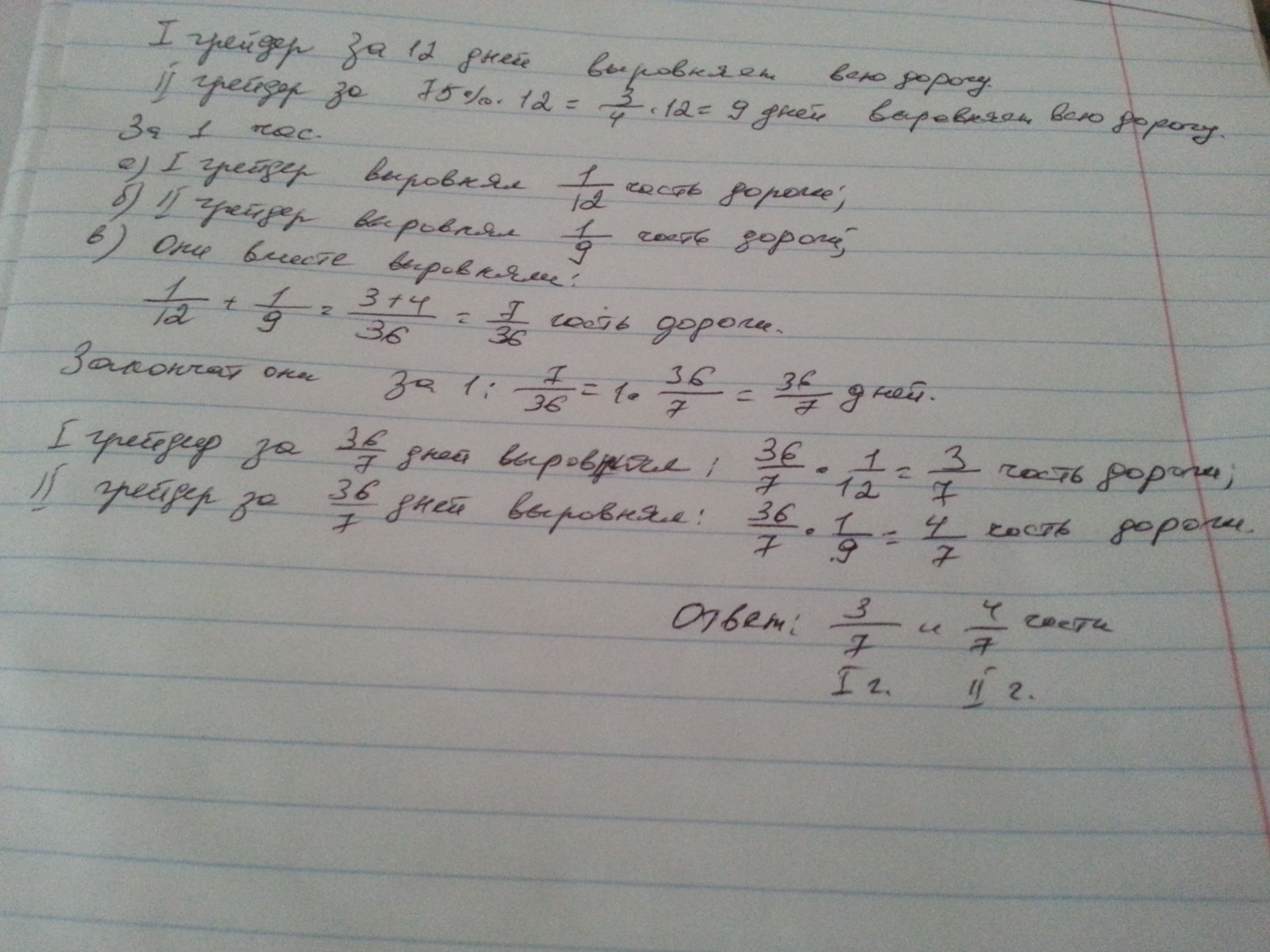 Один грейдер может выровнять участок дороги за 12 дней, а второму надо 75% этого времени. Какую часть дороги выровняет каждый грейдер, если они будут работать вместе?