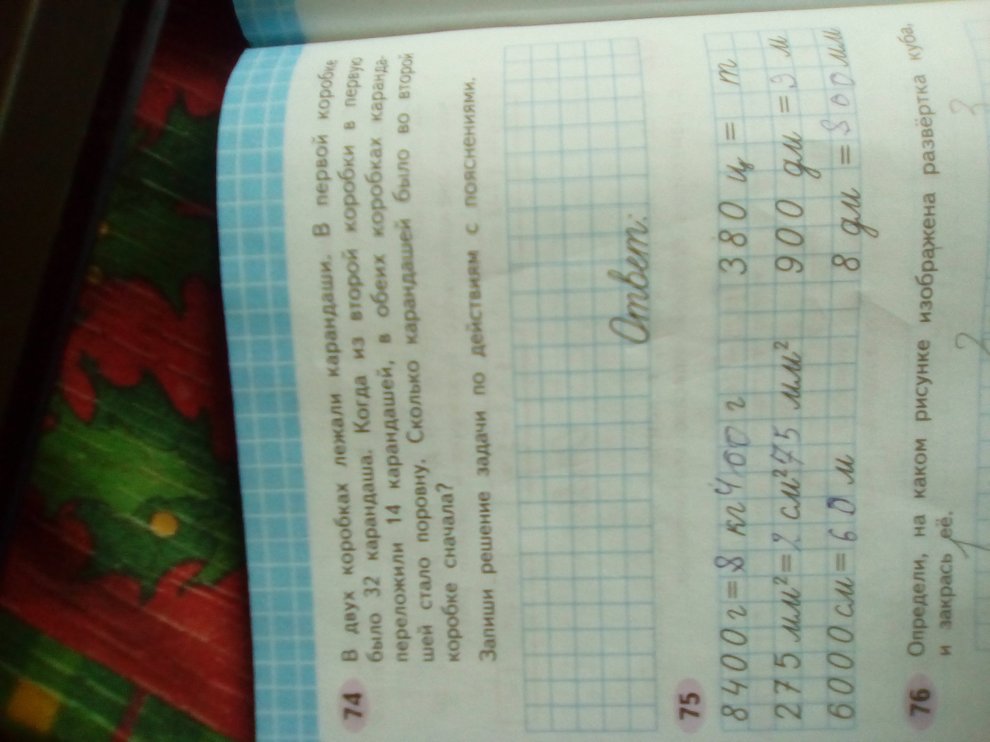 1)32+14=46карандашей стало в 1 коробке