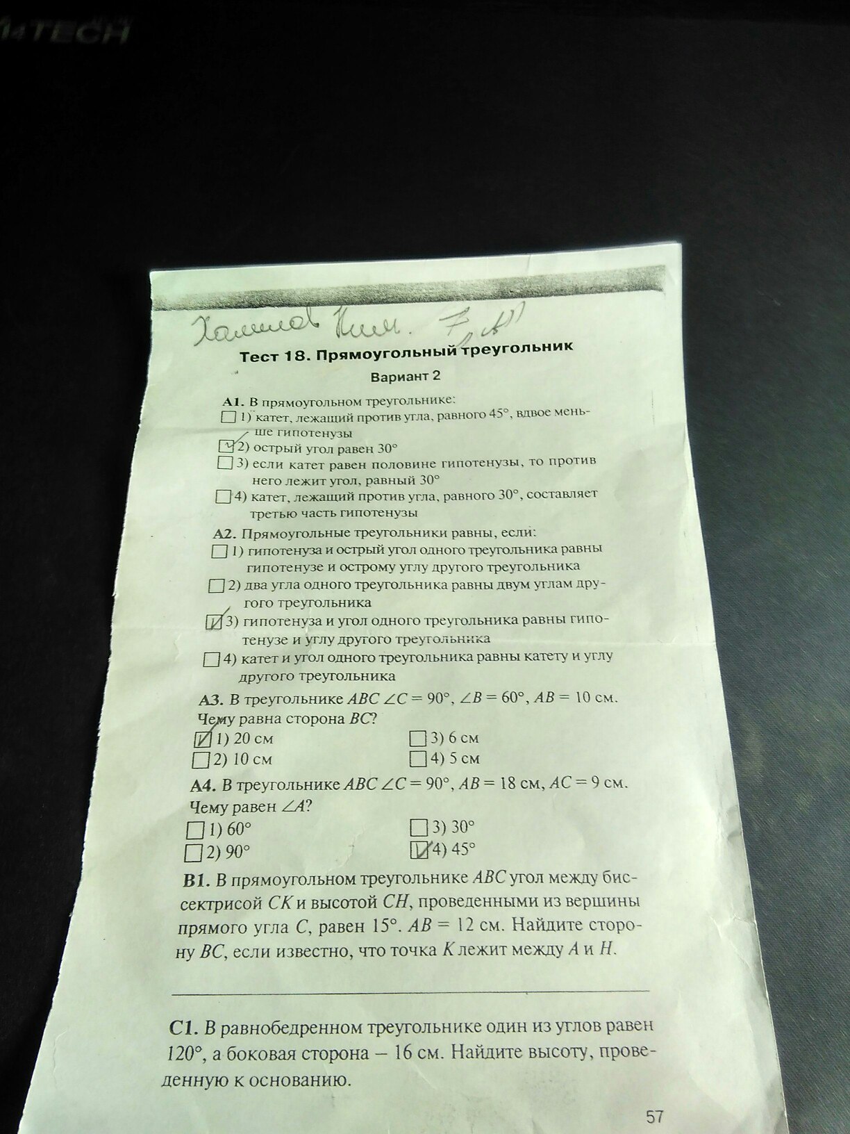 C1) Треугольник ABC, Высота BH. Угол ABC=120 градусов, в равнобедренном треугольнике высота, проведенная к основанию является биссектрисой и медианой. HBC=60 градусов