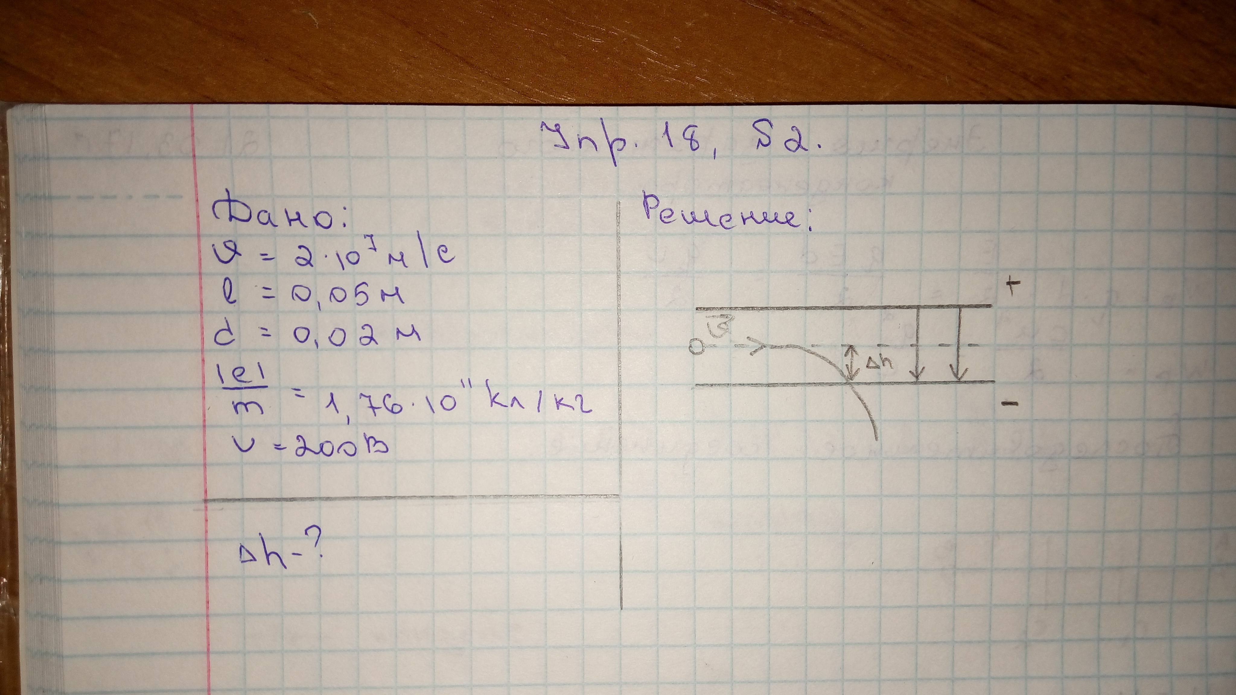 В пространство между пластинами плоского конденсатора влетает электрон со скоростью 2*107 м/с, направленной параллельно пластинам конденсатора. На какое расстояние по направлению к положительно заряженной пластине сместится электрон за время движения внутри конденсатора, если длина конденсатора равна 0,05 м и разность потенциалов между пластинами 200 В? Расстояние между пластинами конденсатора равно 0,02 м. Отношение заряда электрона к его массе равно 1,76*1011 Кл/кг.