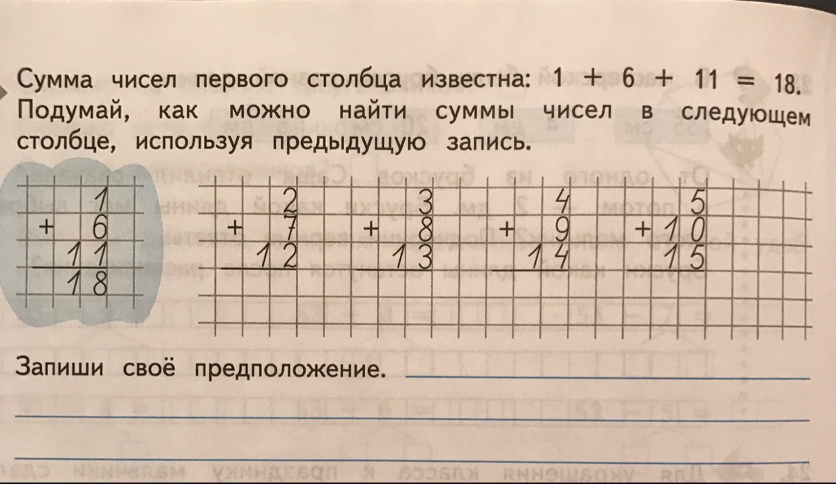 Сумма чисел первого столбца известна: 1+6+11=18. Подумай, как можно найти суммы чисел в следующем столбце, используя предыдущую запись.