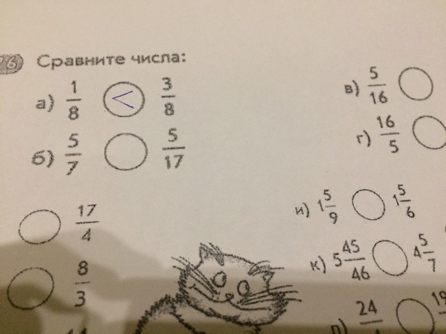 Сравните числа: б)5/7 и 5/17 в) 5/16 и 1 г) 16/5и 1