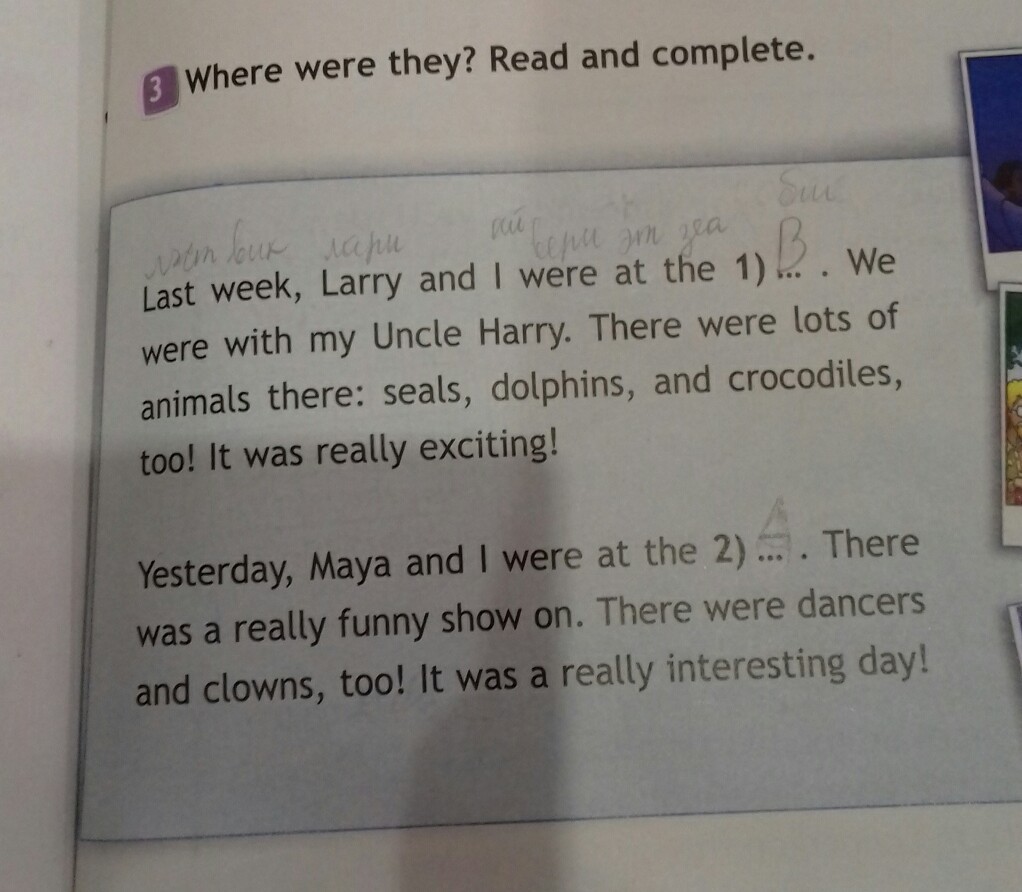На прошлой неделе, Ларри и был на 1) были с моим дядей Гарри было много животных: тюлени, дельфины, и крокодилы, слишком! Это было действительно захватывающе! вчера я, Майя анди были на 2) Есть было очень смешно показать. Там были танцоры и клоуны тоже! Это был очень интересный день!