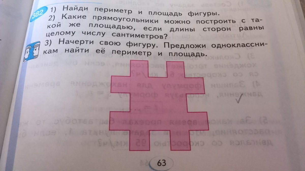1) найди периметр и площадь фигуры 2) какие прямоугольники можно построить с такой же площадью если длины сторон равны целаму числу сантиметров 3)начерти свою фигуру предложи одноклассникам найти её периметр и площадь
