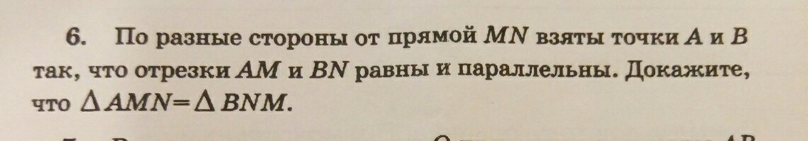 По разные стороны от прямой MN взяты точки A и B так, что отрезки AM и BN равны и параллельны. Докажите, что ΔAMN=ΔBNM