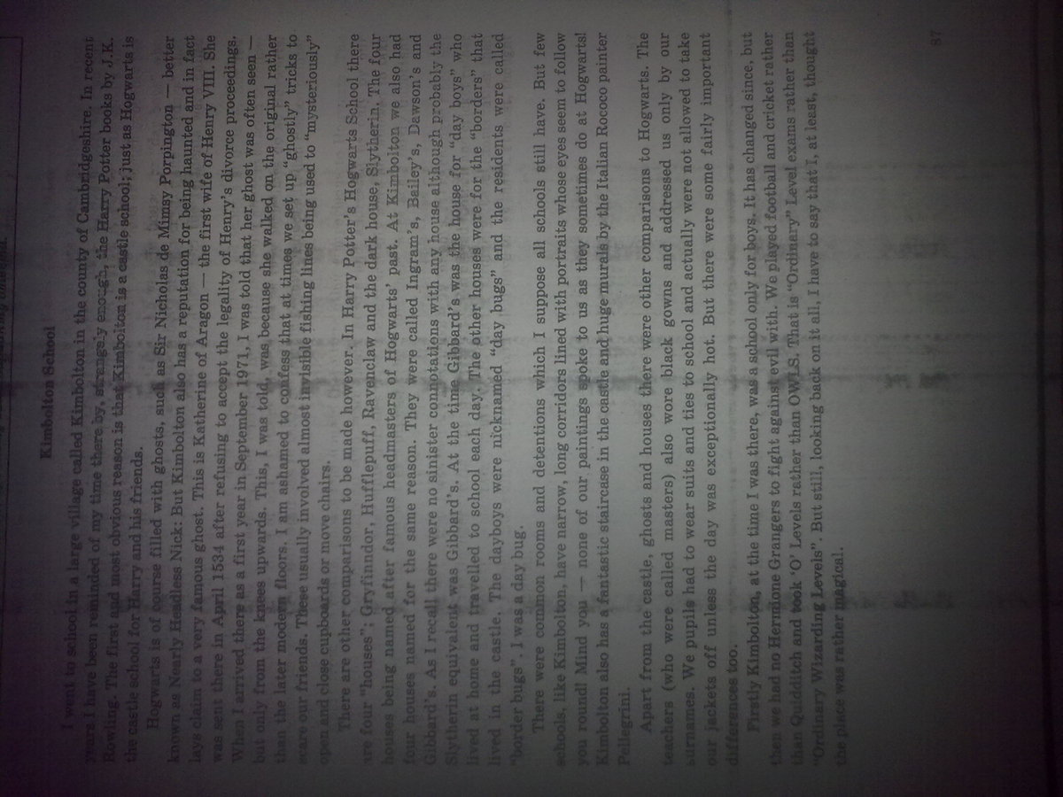 Я пошёл в школу в большой деревне названной Кимболтон, в городе Кембриджшир. Недавно я вспомнил момент из жизни, довольно странный, книга Гарри Поттера написанная Джоанной Роулинг. Первый и самая веская причина это Кимболтон - школа-дворец; как Хогвартс - школа-дворец и школа для Гарри и его друзей.
