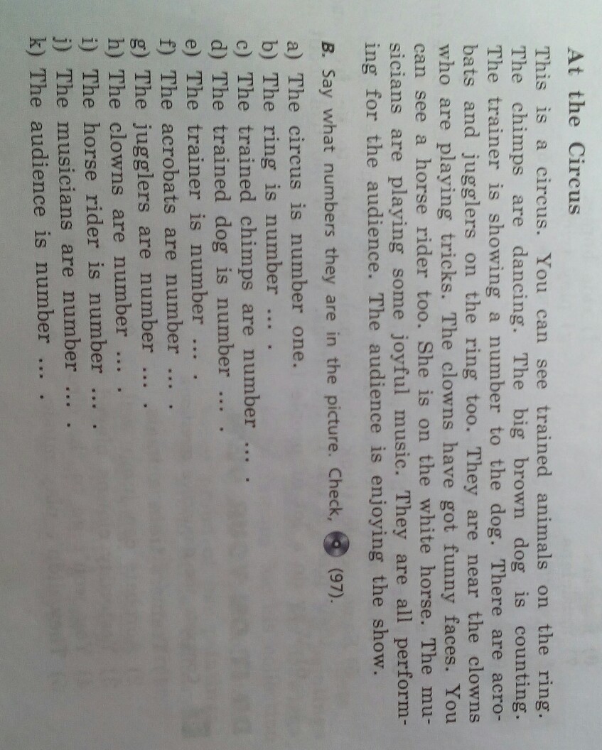 Это цирк. Ты можешь увидеть натренированных животных на арене. Шимпанзе танцуют. Большая коричневая собака считает. Тренер показывает число собаке. Здесь тоже есть акробаты и жонглеры на арене. Они рядом с клоунами, которые исполняют трюки. У клоунов весёлые лица. Ты можешь увидеть наездника лошади тоже. Она на белой лошади. Музыканты играют радостную музыку. Они играют для аудитории. Аудитории нравится шоу.