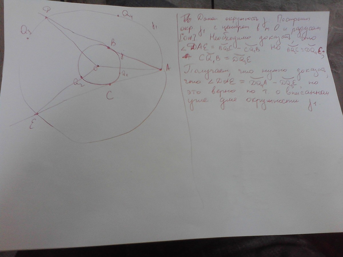 Помогите, пожалуйста, с теоремой о вневписанном угле. Пояснения: вневписанный угол - угол, вершина которого лежит вне окружности, а точки пересечения его 2 лучей ( 2 луча обязательно ее будут пересекать, иначе это будет не вневписанный угол) с окружностью образуют 2 дуги. Нужно доказать, что разность этих 2 дуг равна вневписанному углу.