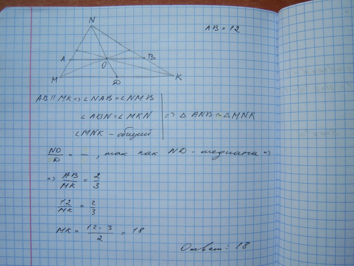 каждая медиана делится точкой О на две части, которые относятся как 2:1, считая от вершины. тр-икANB подобен тр-икMNK. k = 2/3 => MK = 1,5AB = 18