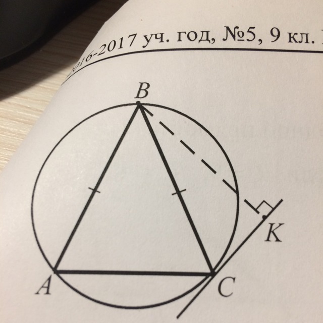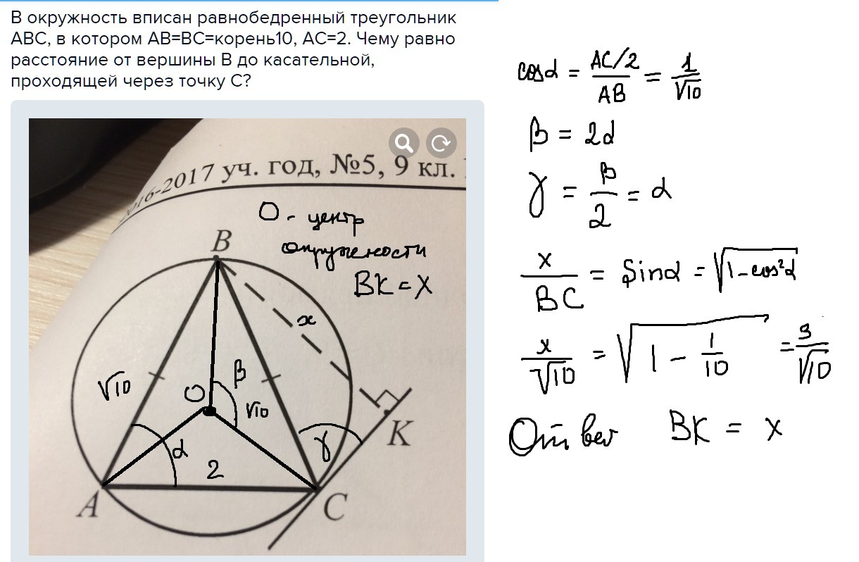В окружность вписан равнобедренный треугольник ABC, в котором AB=BC=корень10, AC=2. Чему равно расстояние от вершины B до касательной, проходящей через точку C?