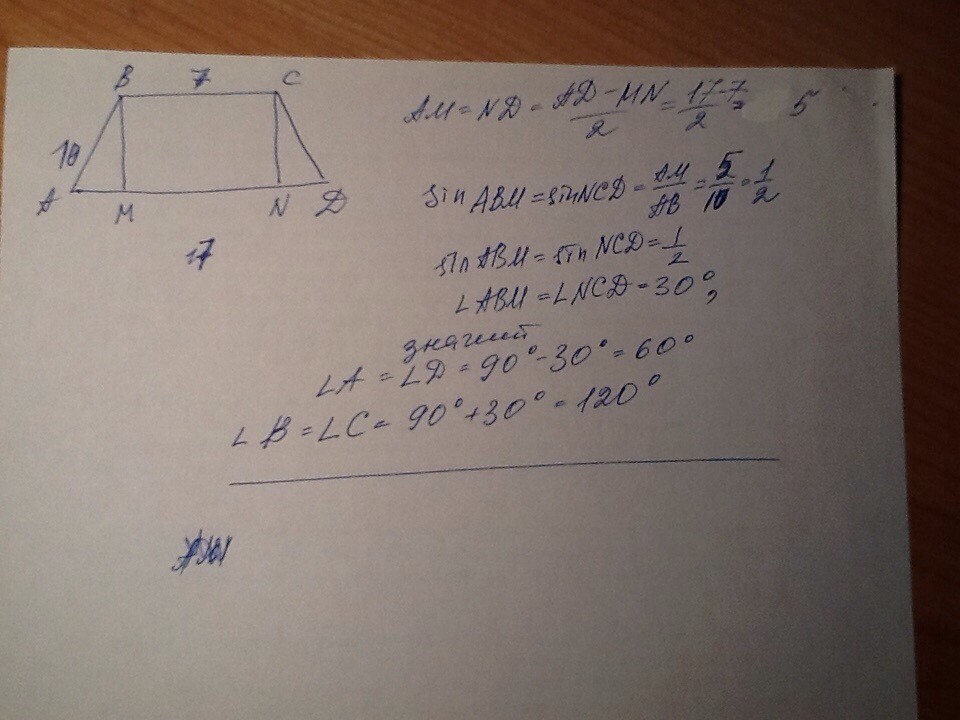 В равнобокой трапеции ABCD известно, что AB=CD=10 см, BC=7 см, AD=17 см. Найдите углы трапеции.
