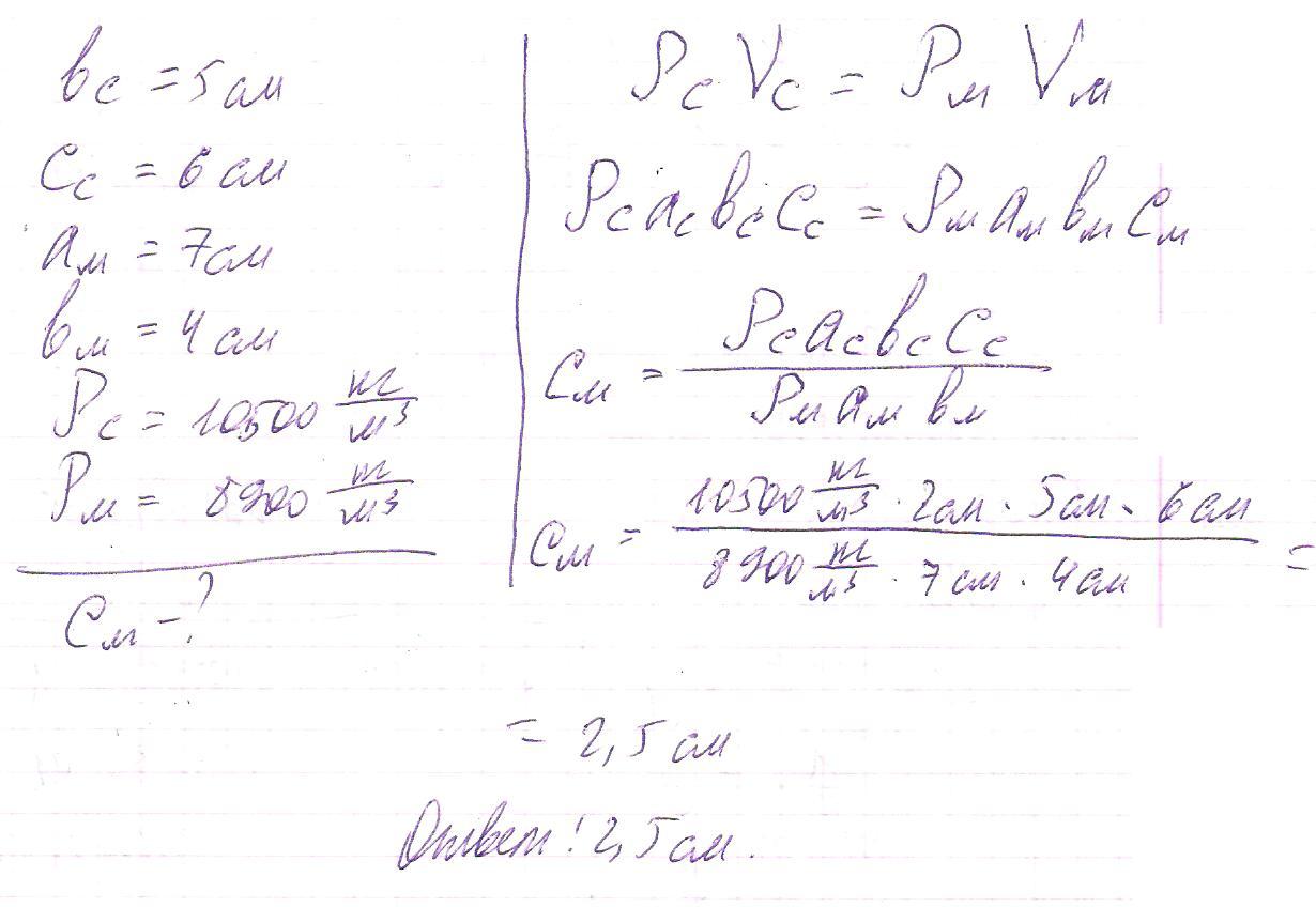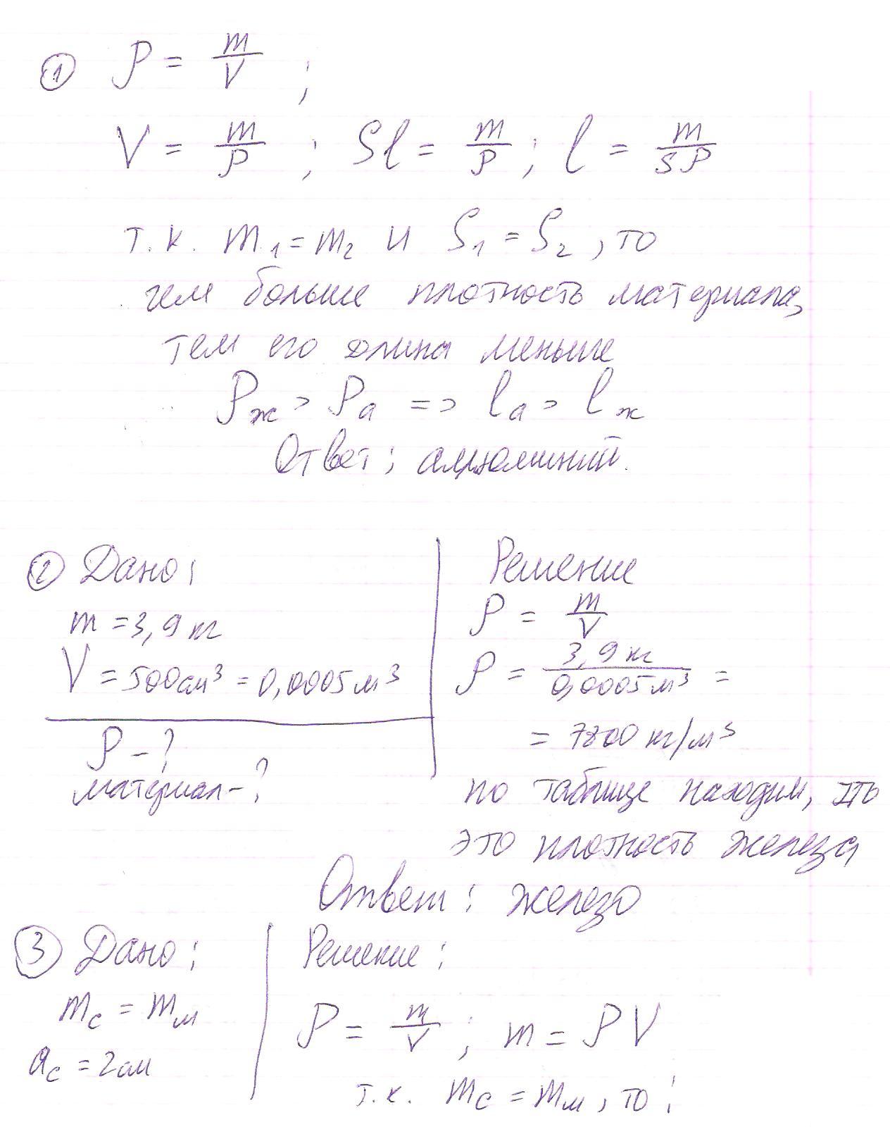 1.Железный и Алюминиевый стержень имеют одинаковые сечения и массу. Какой из стержней длиннее? ( решение без дано , но со объяснением) 2.Из какого металла изготовлена деталь , если ее масса 3,9 кг, а объем 500см^3 ( решение с дано и формулами) 3.Имеются 2 бруска одинаковый массы : серебряный и медный. Размеры серебряного - 2 * 5 * 6 см. Длинна медного бруска 7 см, ширина 4 см. Какова его высота? (решение с дано и формулами)