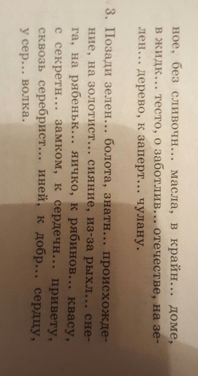 3. Позади зеленого болота (Р.п.) ; знатное происхождение (И.п.) ; на золотистое сияние ( В.п.) ; из-за рыхлого снега (Р.п.) ; на рябенькое яичко (В.п.) ; к рябиновому квасу (Д.п.) ; с секретным замком (Т.п.) ; к сердечному привету (Д.п.) ; сквозь серебристый иней (В.п.) ; к доброму сердцу (Д.п.) ; у серого волка (Р.п.).