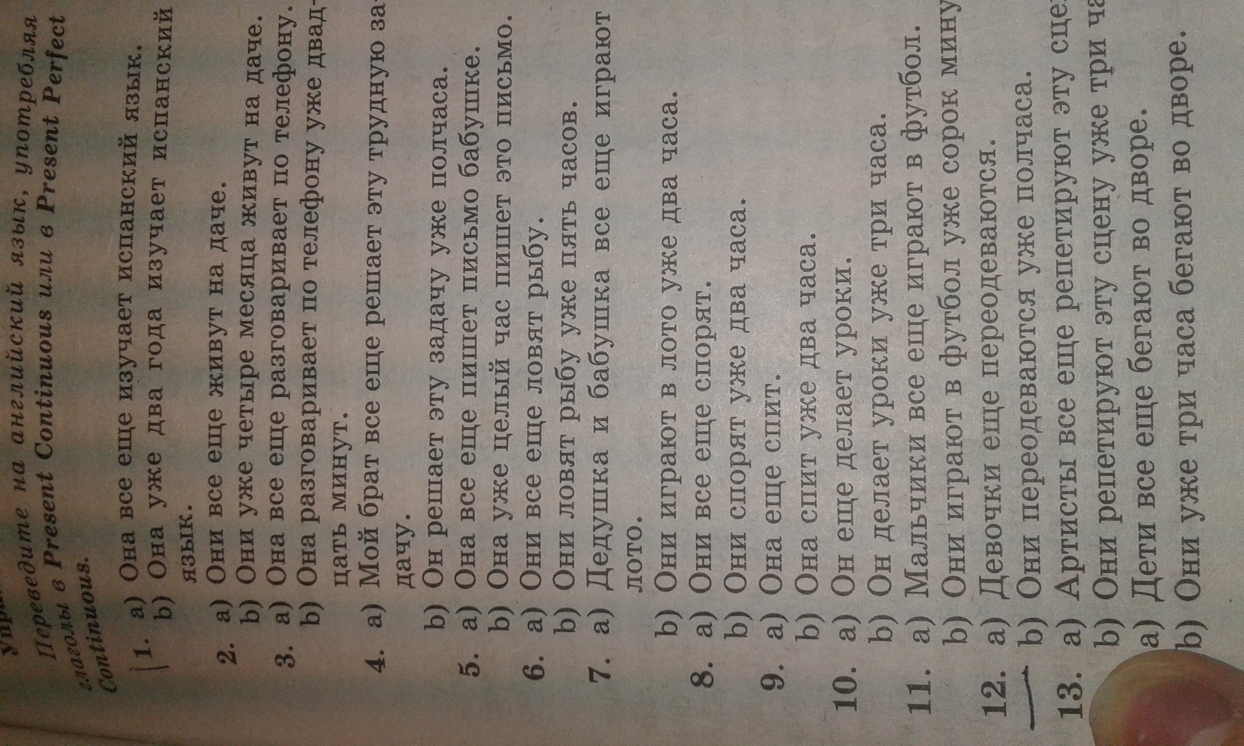 1. a) She is still studying Spanish. b) She has been studying Spanish for two years. 2. a) They are still living in the country. b) They have a been living in the country for four months. 3. a) She is still speaking on the phone. b) She has been speaking on the phone for twenty minutes. 4. a) My brother is still solving this difficult problem. b) He has been solving this problem for half an hour. 5. a) She is still writing a letter to her grandmother. b) She has been writing this letter for an hour. 6. a) They are still fishing. b) They have been fishing for five hours already. 7. a) My grandparents are still playing lotto. b) They have been playing lotto for two hours already. 8. a) They are still arguing. b) They have been arguing for two hours already. 9. a) She is still sleeping. b) She has been sleeping for two hours. 10. a) He is still doing his homework. b) He has been doing his homework for three hours already. 11. a) The boys are still playing football. b) They have been playing football for forty minutes. 12. a) The girls are still changing their clothes. b) They have been changing their clothes for half an hour.