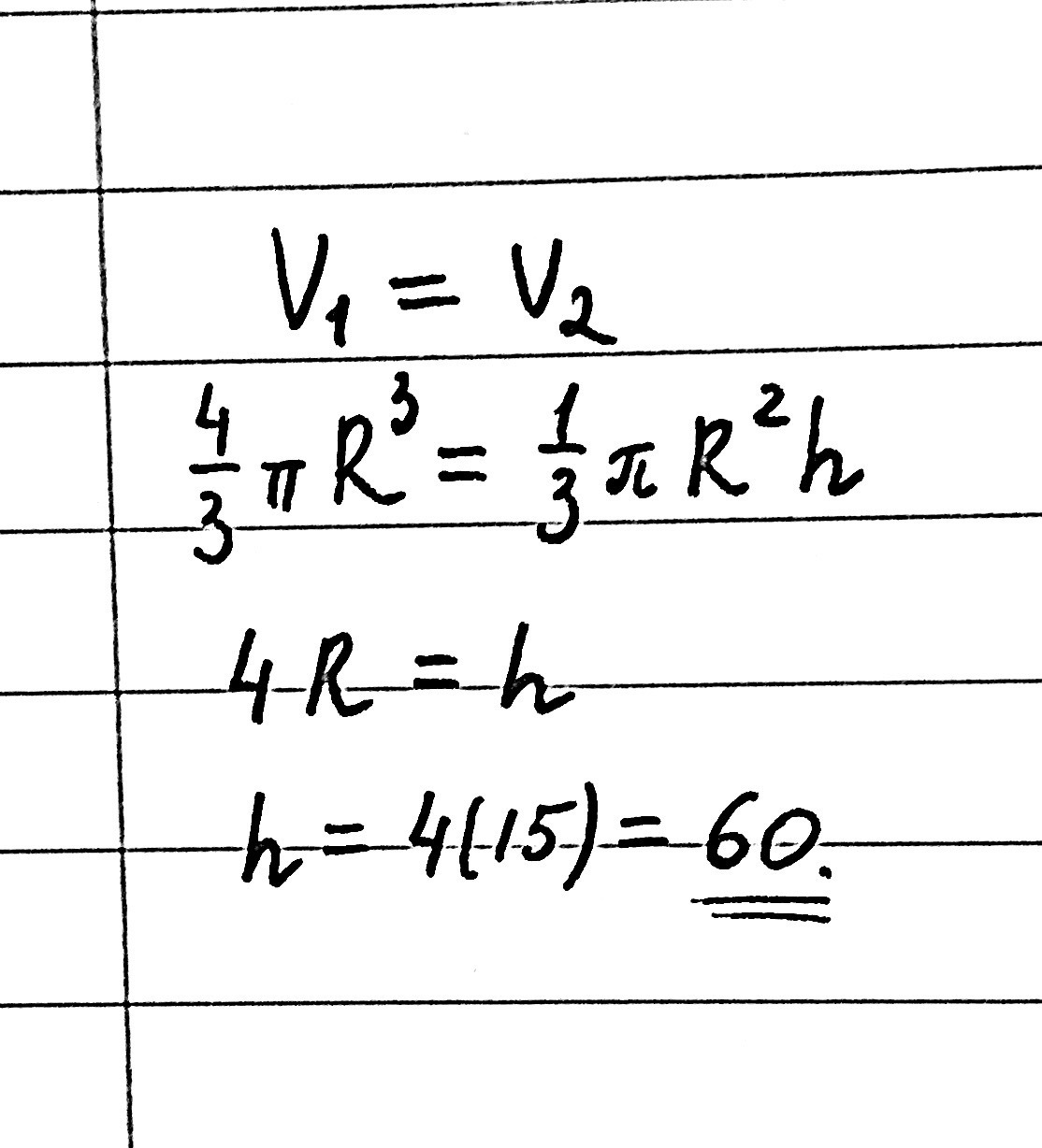 Металлический шар радиуса 15 был перелит в конус, радиус основания которого тоже 15. Найдите высоту конуса