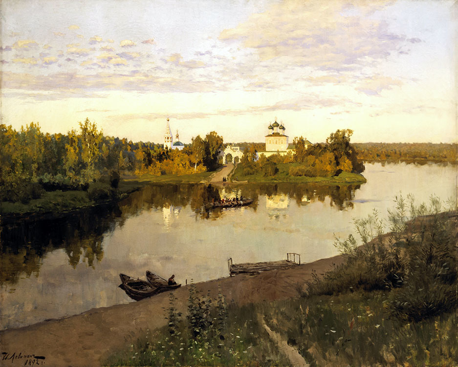 Центральную часть экспозиции картины занимает река. Ее серо-голубые оттенки мягко воздействуют на смотрящего, словно призывая насладиться спокойствием и магическим очарованием летнего пейзажа. Основной акцент приходится на утопающий в зелени монастырь и колокольню, созерцание которых возносит человека над мирской суетой. Так и хочется задержаться взглядом на залитом вечерними лучами солнца полуостровке: святая обитель, тающие в небе кресты куполов, широкая дорога к вратам монастыря. И.И.Левитан неслучайно изобразил прямо у реки двух одетых в черное иноков. Они настолько малы, что преодоление пути до сверкающей белой арки кажется чем-то невыполнимым. И все же дорога к Богу вдали от искушений света довольно просторна, а осилить ее сможет только идущий.