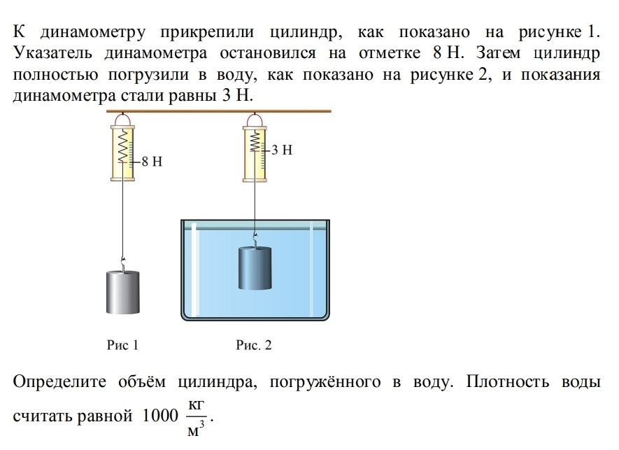 к динамометру прикрепили цилиндр как показано на рисунке 1. указатель динамометра остановился на отметке 8Н. затем цилиндр полностью погрузили в воду кае показано на рисунке 2, и показания динамометра стали равны 3Н