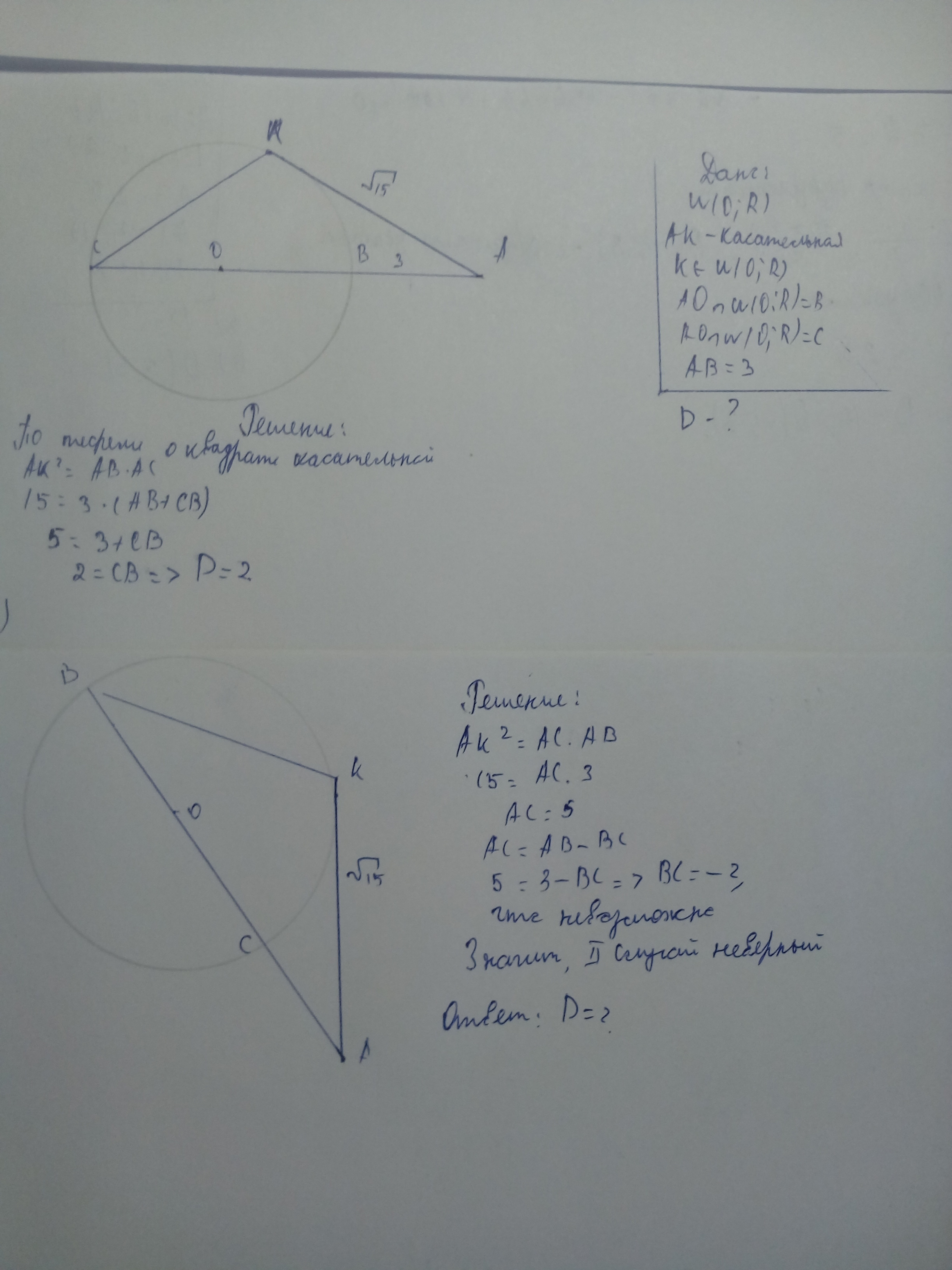 К окружности с центром в точке О проведена касательная АК ( К- точка касания), домов отрезка АК равна √15. Прямая АО пересекает окружность в точках В и С, причём АВ = 3. Найдите диаметр окружности.