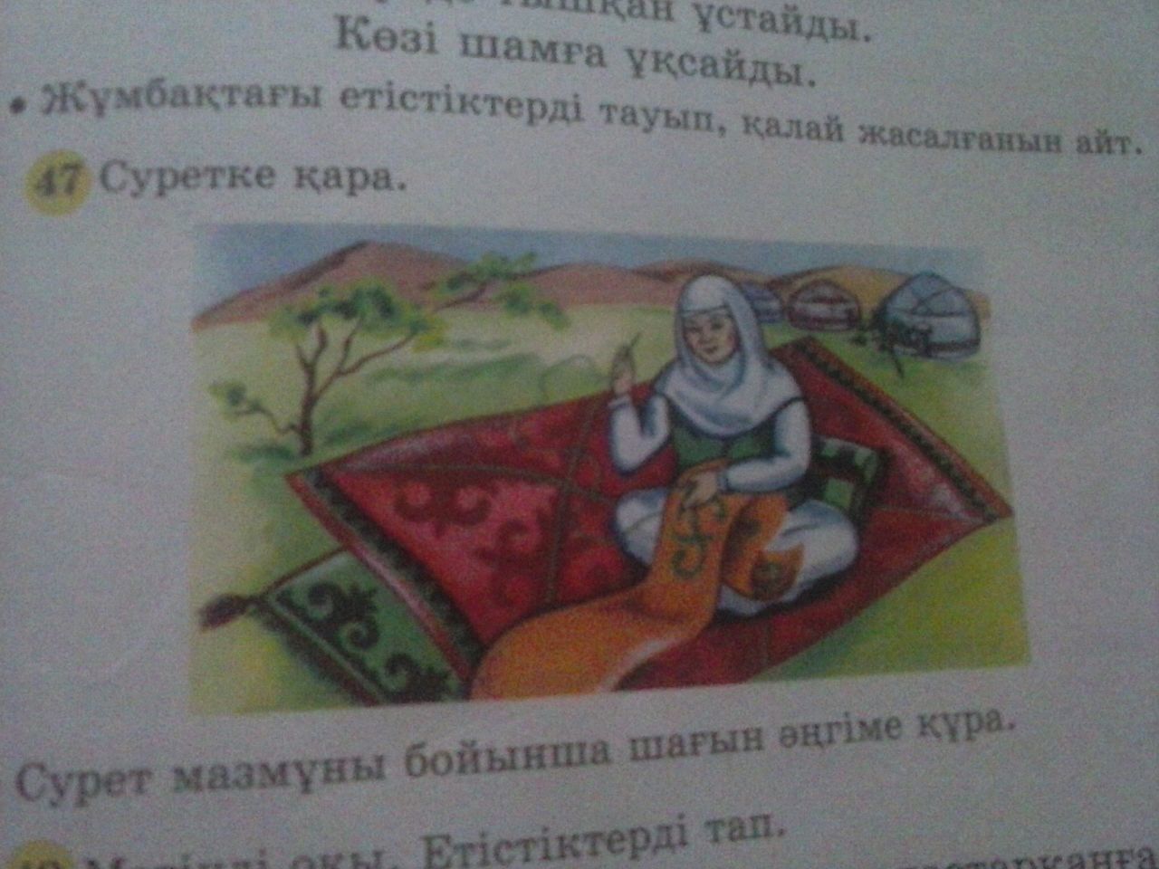 Менің əжем жайлау ішінде кілем тоқып отыр.Əжемнің астында көрпелер жатыр.Сол күні күн де жап жарық болды.Осы кілемді əжем тоқығаны үшін көп рахмет айтамын!