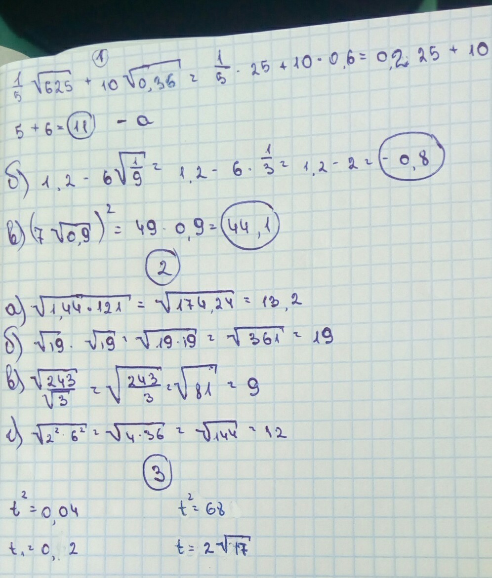 a) ¹/₅ √625 + 10√0.36 = ¹/₅ * 25 + 10*0.6=5+6=11