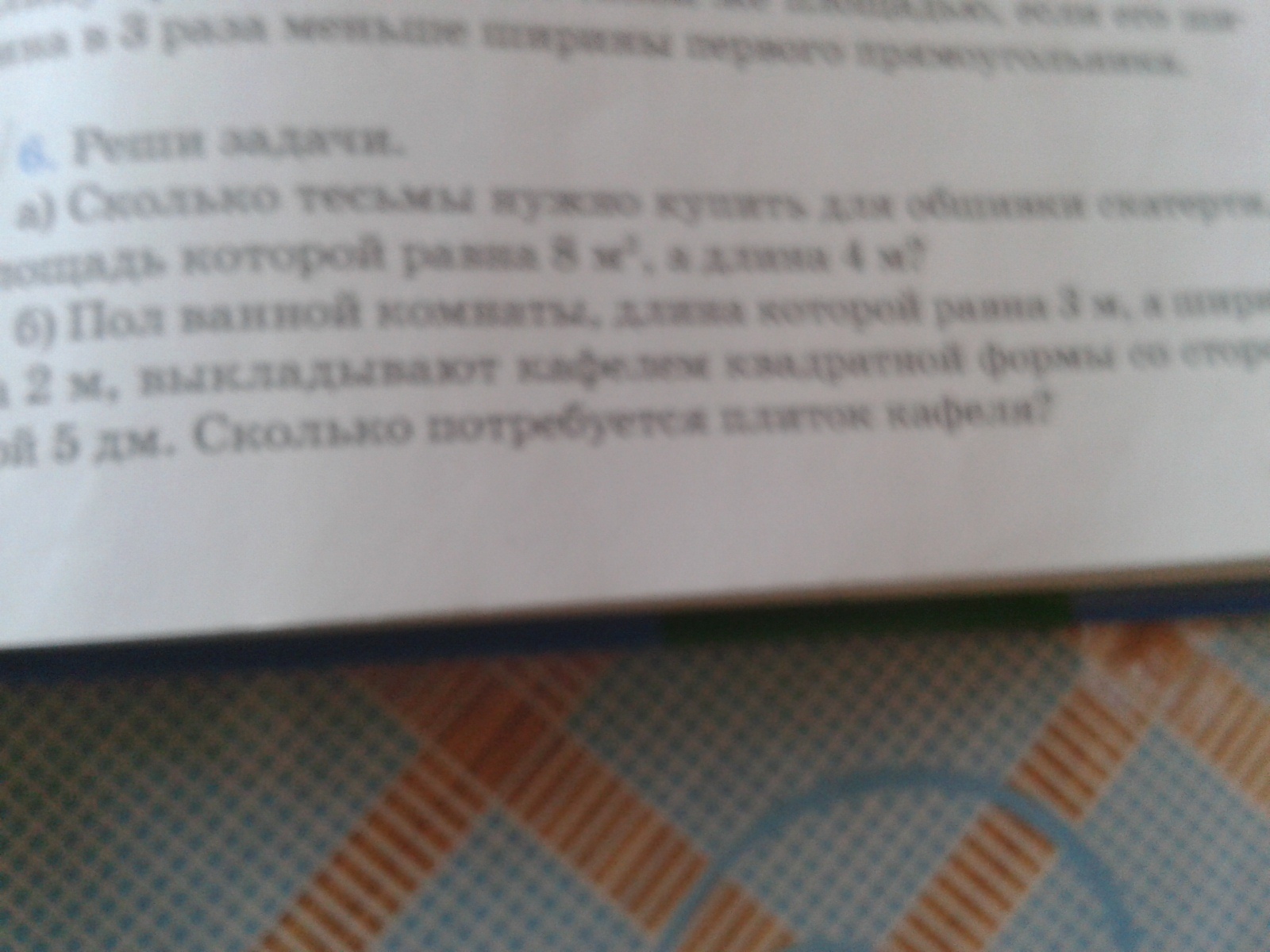 Реши задачи. Сколько тест мы нужно купить для обшивки скатерти площадь которой равна 8м2, а длина4м?