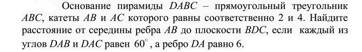 Далее найдем площадь треугольника BDC, запишем объем пирамиды через площадь этой грани и высоту, на нее опущенную, приравняем к полученному выше объему, откуда найдем неизвестную высоту. Требуемое расстояние, очевидно, в 2 раза меньше этой высоты.