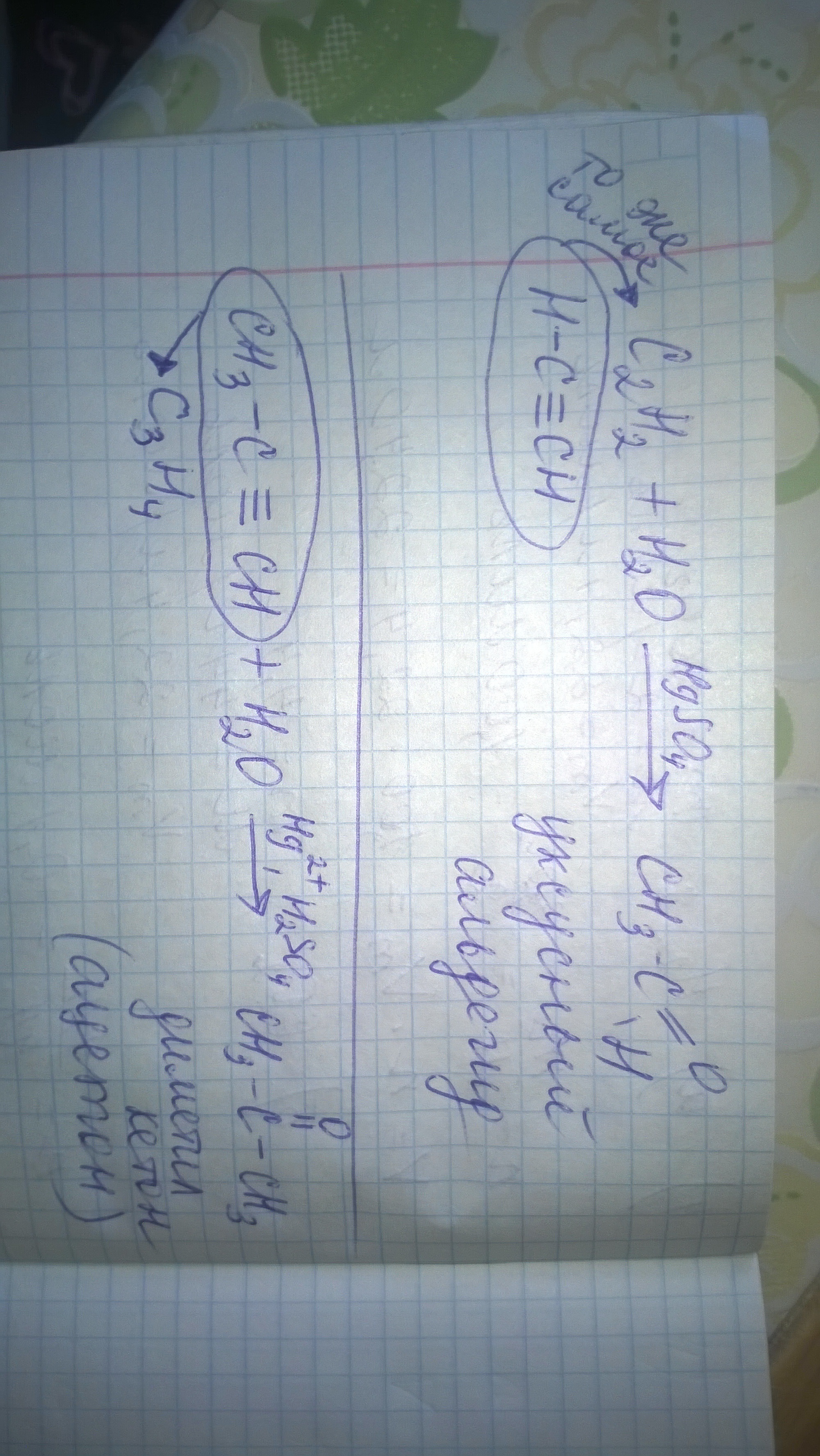 Напишите уравнения реакций этина и пропина с водой в присутствии HgSO4 (реакция Кучерова). Назовите продукты реакций.